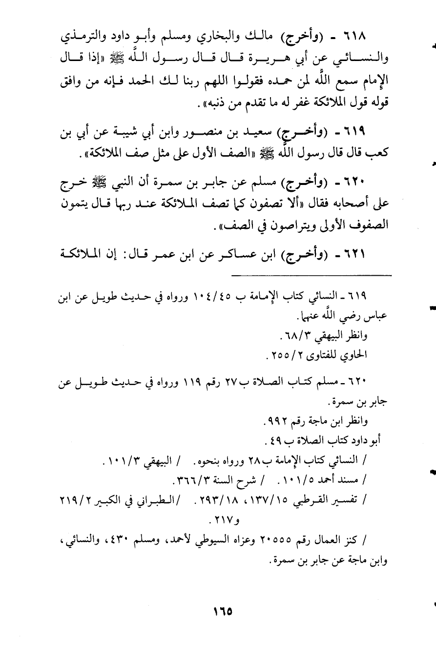 وأخرج مسلم عن جابر بن سمرة: أن النبي صلى الله عليه وسلم خرج على أصحابه فقال:) ألا تصفون كما تصف الملائكة عند ربها؟.. قال: يتمون الصفوف الأولى ويتراصون في الصف (.