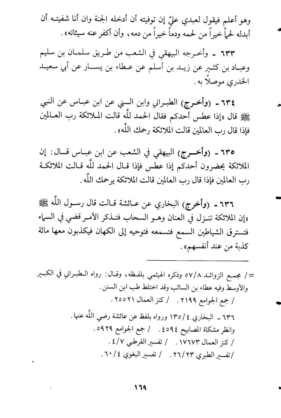 وأخرج البيهقي في الشعب عن ابن عباس قال: إن الملائكة يحضرون أحدكم إذا عطس فإذا قال: الحمد لله، قالت الملائكة: رب العالمين، فإذا قال: رب العالمين، قالت الملائكة: يرحمك الله.