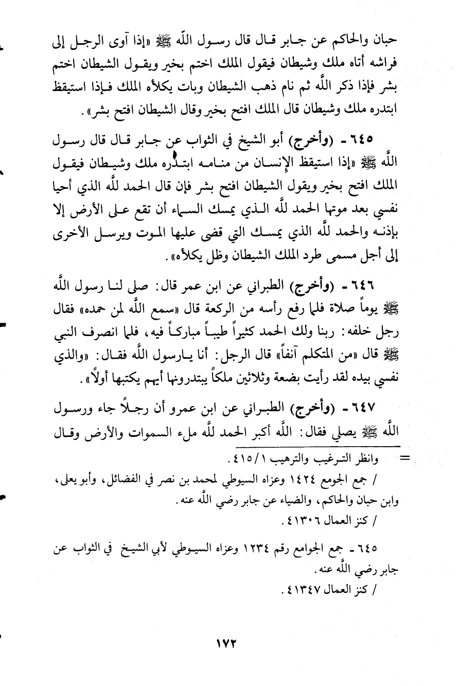حيان والحاكم عن جابر قال: قال رسول الله صلى الله عليه وسلم:) إذا أوى الرجل إلى فراشه أتاه ملك وشيطان، فيقول الملك: اختم بخير ويقول الشيطان: اختم بشر فإذا ذكر الله ثم نام ذهب الشيطان وبات يكلأه الملك، فإذا استيقظ ابتدره ملك وشيطان قال الملك: افتح بخير وقال الشيطان: افتح بشر (.