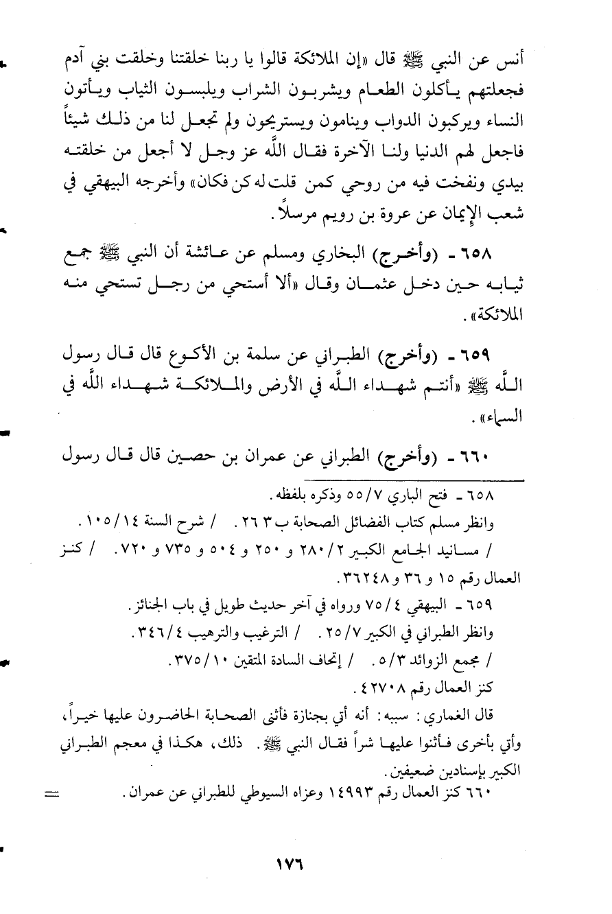 أنس عن النبي صلى الله عليه وسلم قال:) إن الملائكة قالوا: ربنا خلقتنا وخلقت بني آدم فجعلتهم يأكلون الطعام ويشربون الشراب ويلبسون الثياب ويأتون النساء ويركبون الدواب وينامون ويستريحون ولم تجعل لنا من ذلك شيئا، فاجعل لهم الدنيا ولنا الآخرة، فقال الله عز وجل: لا أجعل من خلقته بيدي ونفخت فيه من روحي كمن قلت له كن فكان (.