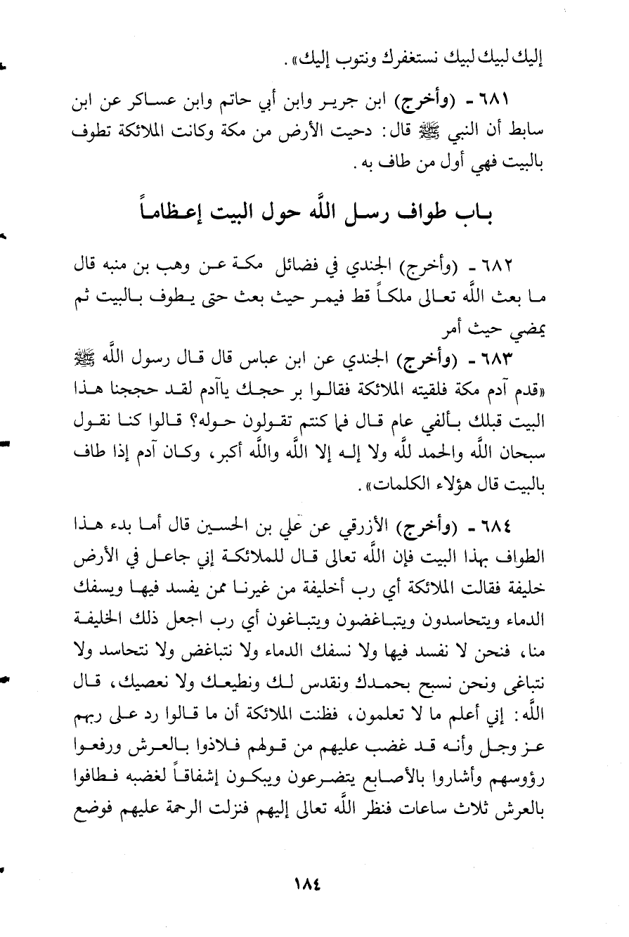 وأخرج الجندي عن ابن عباس قال: قال رسول الله صلى الله عليه وسلم:) قدم آدم مكة فلقيته الملائكة فقالوا: بر حجك يا آدم لقد حججنا هذا البيت قبلك بألفي عام، قال: فما كنتم تقولون حوله؟ قالوا: كنا نقول: سبحان الله والحمد لله ولا إله إلا الله والله أكبر، وكان آدم إذا طاف بالبيت قال هؤلاء الكلمات (.