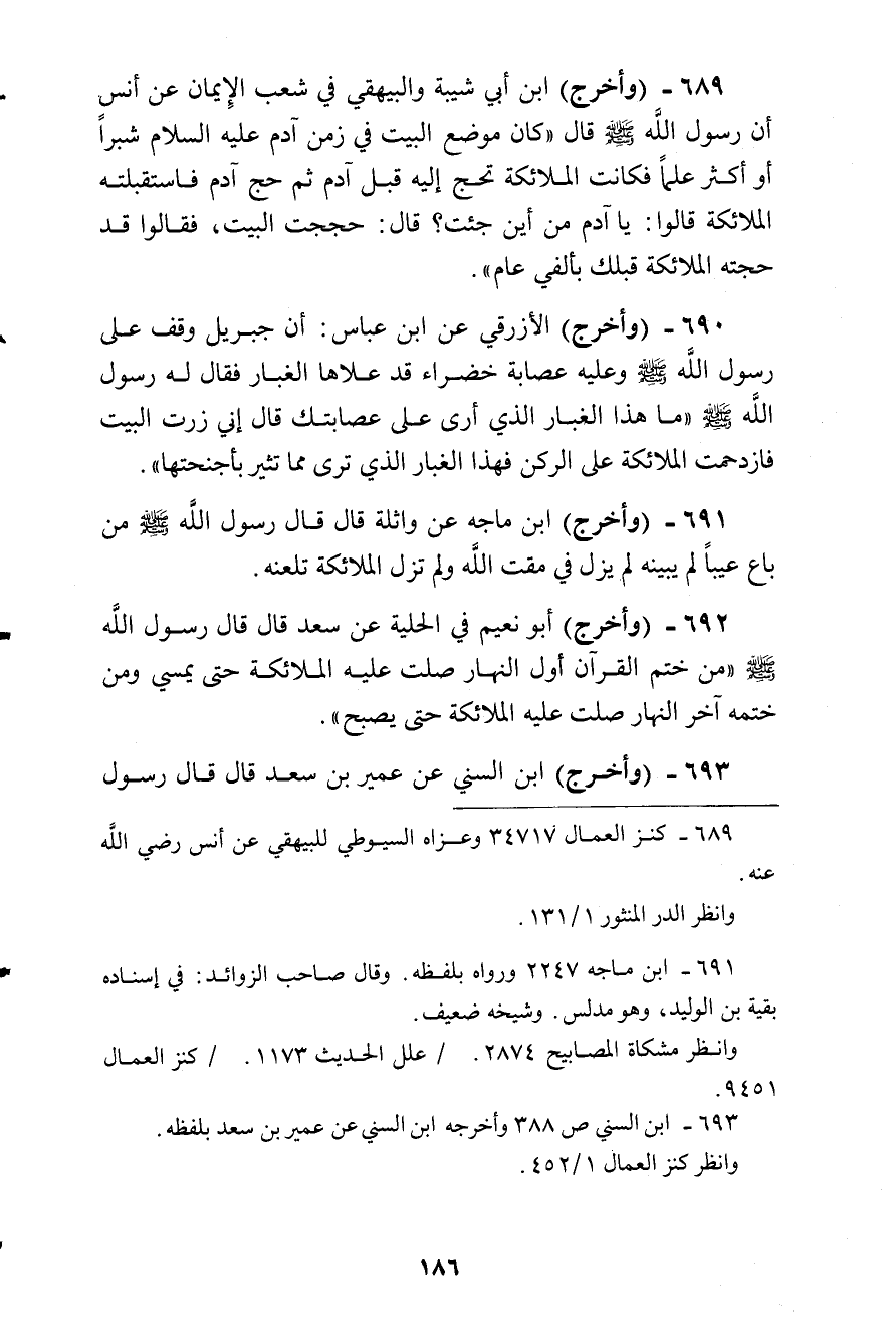 وأخرج الأزرقي عن ابن عباس: أن جبريل وقف على رسول الله صلى الله عليه وسلم وعليه عصابة خضراء قد علاها الغبار، فقال له رسول الله صلى الله عليه وسلم:) ما هذا الغبار الذي أرى على عصابتك؟ قال: إني زرت البيت فازدحمت الملائكة على الركن فهذا الغبار الذي ترى مما تثير بأجنحتها (.