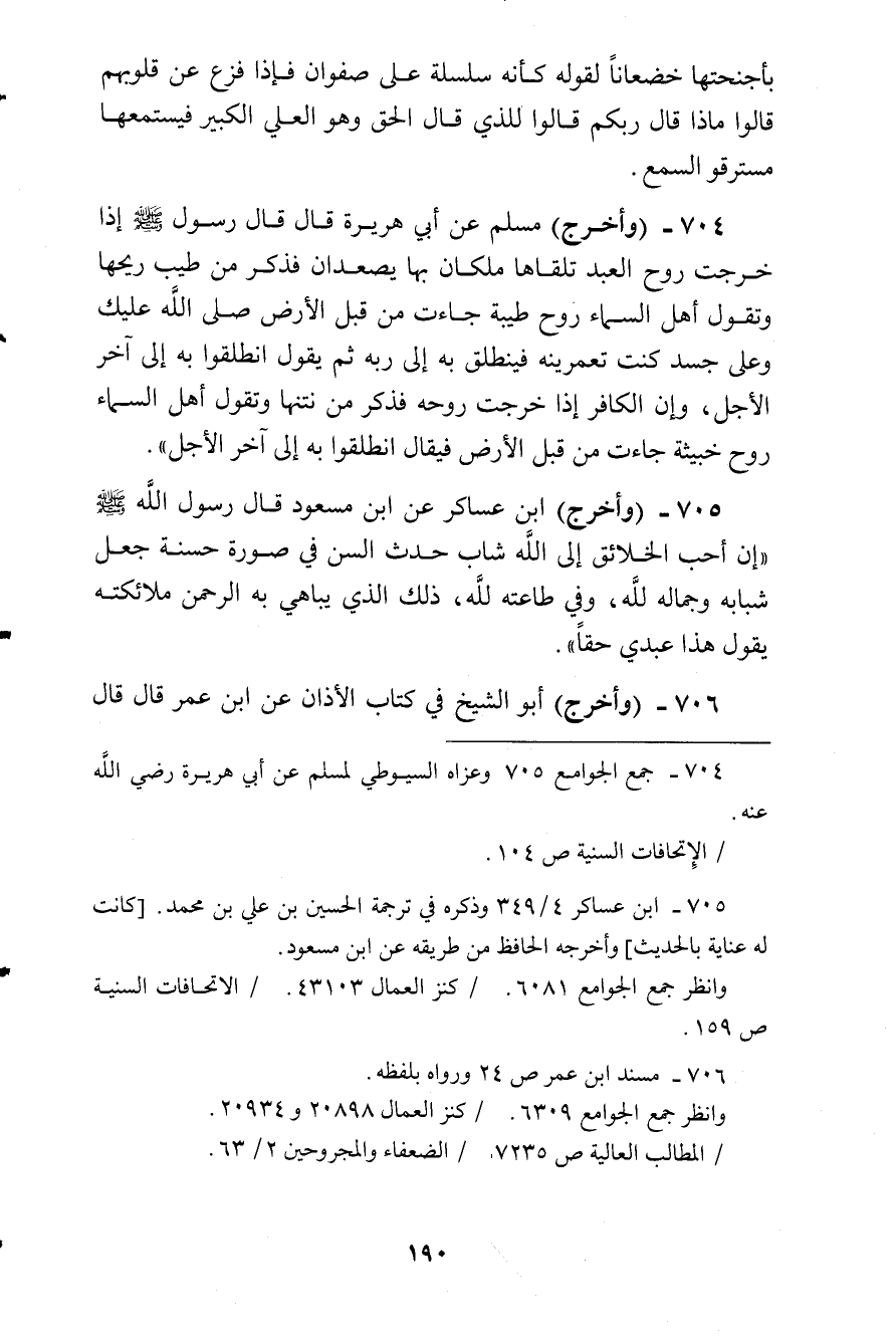 وأخرج مسلم عن أبي هريرة قال: قال رسول الله صلى الله عليه وسلم:) إذا خرجت روح العبد تلقاها ملكان بها يصعدان، فذكر من طيب ريحها، وتقول أهل السماء: روح طيبة جاءت من قبل الأرض، صلى الله عليك وعلى جسد كنت تعمرينه، فينطلق به إلى ربه، ثم يقول: انطلقوا به إلى آخر الأجل، وإن الكافر إذا خرجت روحه - فذكر من نتنها - وتقول أهل السماء: روح خبيثة جاءت من قبل الأرض، فيقال: انطلقوا به إلى آخر الأجل (.