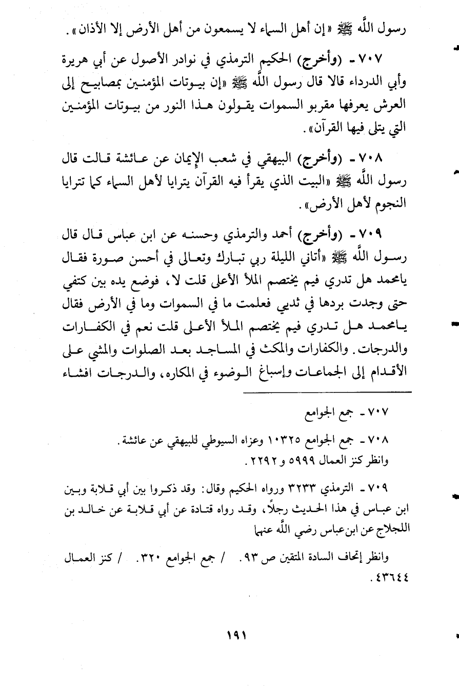 وأخرج أحمد والترمذي وحسنه عن ابن عباس قال: قال رسول الله صلى الله عليه وسلم:) أتاني الليلة ربي تبارك وتعالى في أحسن صورة، فقال: يا محمد هل تدري فيم يختسم الملأ الأعلى؟ قلت: لا فوضع يده بين كتفي حتى وجدت بردها في ثدييى فعلمت ما في السموات وما في الأرض، فقال: يا محمد هل تدري فيم يختصم الملأ الأعلى؟ قلت: نعم، في الكفارات والدرجات؛ والكفارات المكث في المساجد بعد الصلوات، والمشي على الأقدام إلى الجماعات، وإسباغ الوضوء في المكاره؛ والدرجات إفشاء