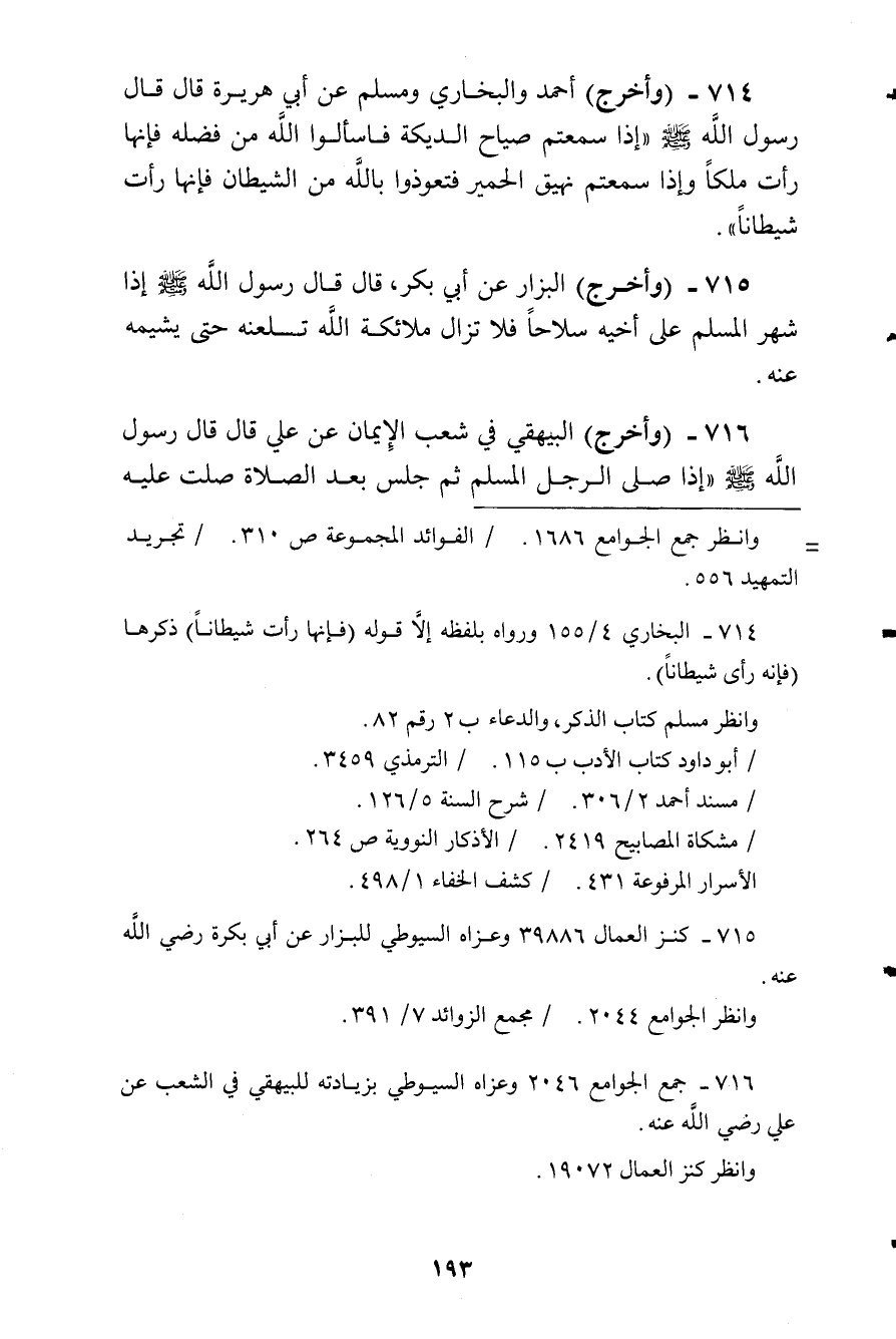 وأخرج أحمد والبخاري ومسلم عن أبي هريرة قال: قال رسول الله صلى الله عليه وسلم:) إذا سمعتم صياح الديكة فاسألوا الله من فضله فإنها رأت ملكا، وإذا سمعتم نهيق الحمير فتعوذوا بالله من الشيطان فإنها رأت شيطانا (.
