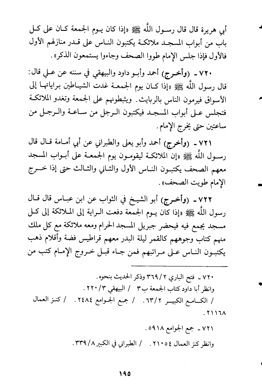 وأخرج أحمد وأبو يعلى والطبراني عن أبي أمامة قال: قال رسول الله صلى الله عليه وسلم:) إن الملائكة ليقومون يوم الجمعة على أبواب المسجد معهم الصحف يكتبون الناس الأول والثاني والثالث حتى إذا خرج افيمام طويت الصحف (.