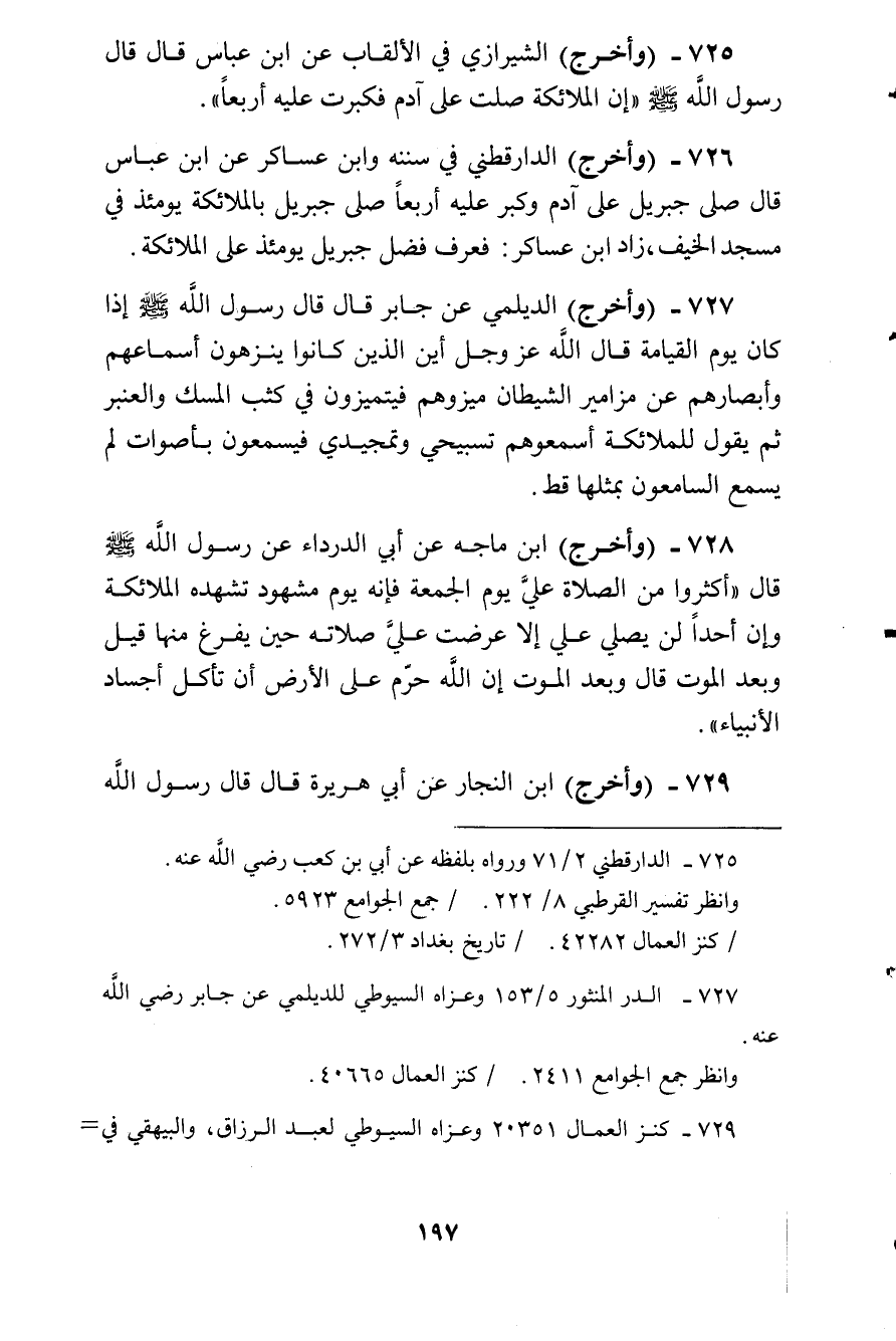 وأخرج ابن ماجه عن أبي الدرداء عن رسول الله صلى الله عليه وسلم قال:) أكثروا من الصلاة علىّ يوم الجمعة فإنه يوم مشهود تشهده الملائكة، وإن أحدا لن يصلى علىّ إلا عرضت على صلاته حين يفرغ منها (قيل: وبعد الموت؟ قال: وبعد الموت، إن الله حرم على الأرض أن تأكل أجساد الأنبياء (.