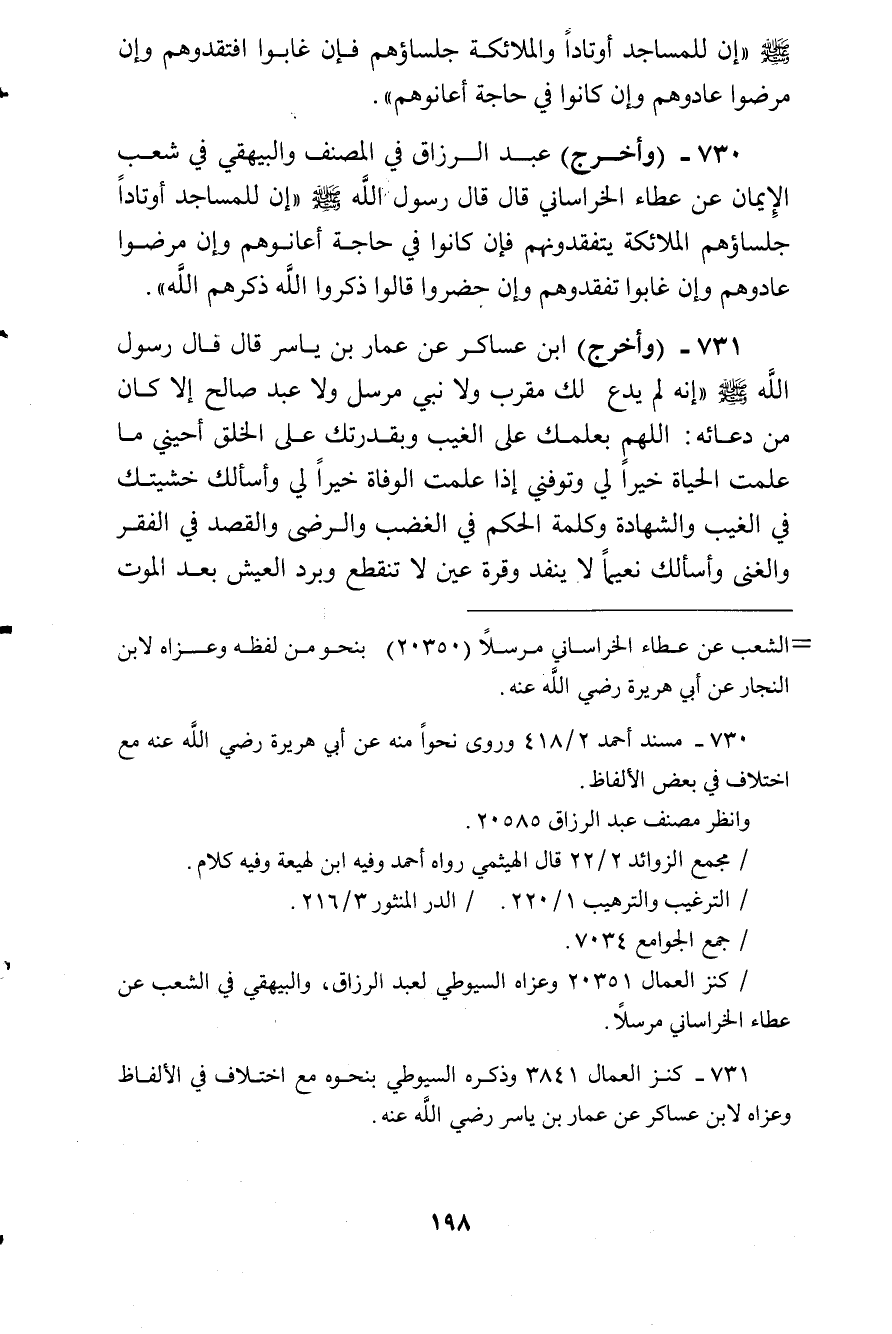 وأخرج عبد الرزاق في المصنف والبيهقي في شعب الإيمان عن عطاء الخراساني قال: قال رسول الله صلى الله عليه وسلم:) إن للمساجد أوتادا جلساؤهم الملائكة يتفقدونهم فإن كانوا في حاجة أعانوهم، وإن مرضوا عادوهم، وإن غابوا اقتقدوهم وإن حضروا قالوا: ذكروا الله ذكرهم الله (.