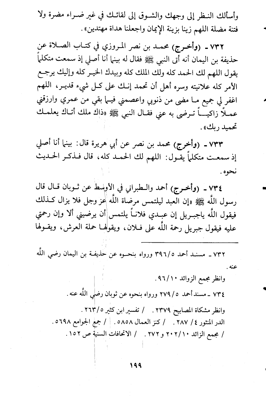 وأخرج محمد بن نصر المروزي في كتاب الصلاة عن حذيفة بن اليمان أنه أتى النبي صلى الله عليه وسلم فقال له: بينما أنا أصلي إذ سمعت متكلما يقول: اللهم لك الحمد كله ولك الملك كله وبيدك الخير كله وغليك يرجع الأمر كله علانيته وسره، أهل أن تحمد إنك على شيء قدير، اللهم اغفر لي جميع ما مضى من ذنوبي، واعصمني فيما بقى منعمر، وارزقني عملا راكيا ترضى به عني فقال النبي صلى الله عليه وسلمك) ذاك ملك أتاك يعلمك تحميد ربك (.