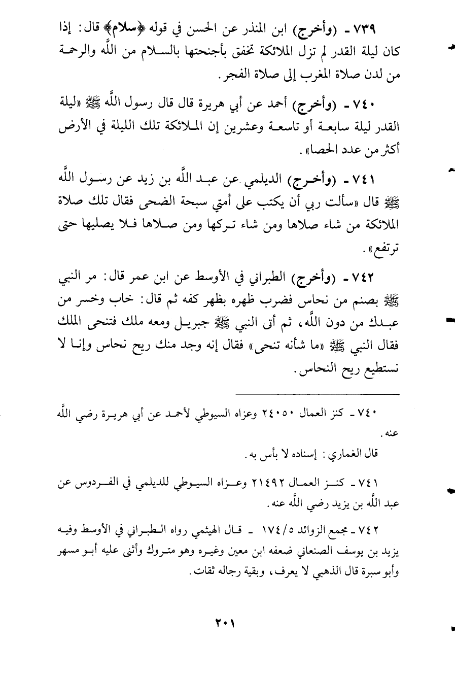 وأخرج أحمد عن أبي هريرة قال: قال رسول الله صلى الله عليه وسلم:) ليلة القدر ليلة سابعة أو تاسعة وعشرين، إن الملائكة تلك الليلة في الأرض أكثر من عدد الحصا (.