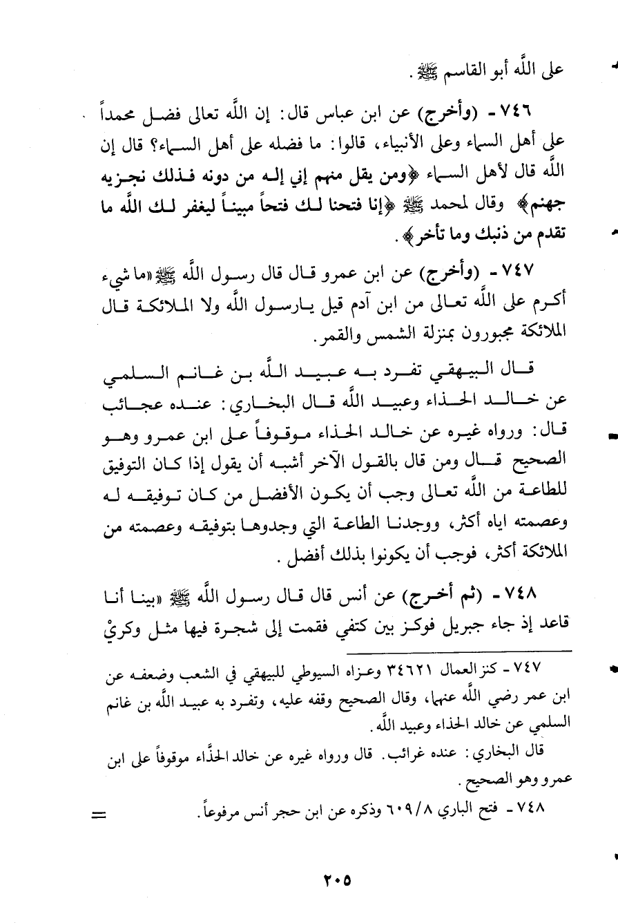 وأخرج عن ابن عمرو قال: قال رسول الله صلى الله عليه وسلم:) ما شيء أكرم على الله تعالى من ابن آدم، قيل: يا رسول الله ولا الملائكة؟ قال: الملائكة مجبورون بمنزلة الشمس والقمر " قال البيهقي: تفرد به عبيد الله بن غانم السلمي عن خالد الحذاء وعبيد الله قال البخاري: عنده عجائب قال ورواة غيره عن خالد الحذاء موقوفا على ابن عمرو وهو الصحيح قال: ومن قال بالقول الآخر أشبه أن يقول: إذا كان التوفيق للطاعة من الله تعالى؛ وجب أن يكون الأفضل من كان توفيقه له وعصمته إياه أكثر، ووجدنا الطاعة التي وجوها بتوفيقه وعصمته من الملائكة أكثر، فوجب أن يكونوا بذلك أفضل.