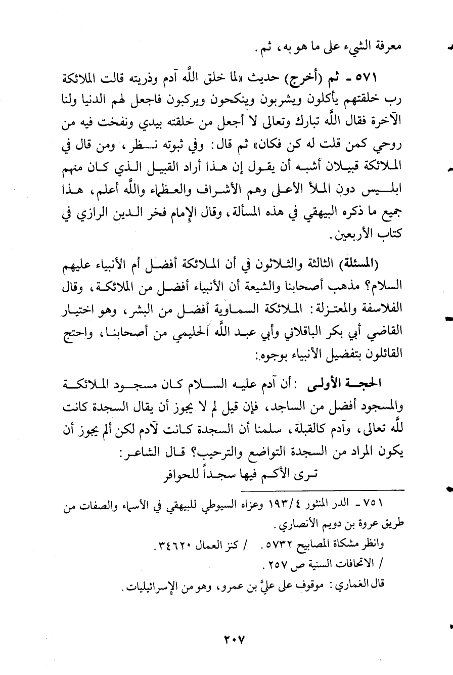 لما خلق الله آدم وذريته قالت الملائكة: رب خلقتهم يأكلون ويشربون وينكحون ويركبون فاجعل لهم الدنيا ولنا الآخرة فقال الله تبارك وتعالى: لا أجعل من خلقته بيدي ونفخت فيه من روحي كمن قلت له كن فكان (ثم قال: وفي ثبوته نظر، ومن قال في الملائكة قبيلان أشبه أن يقول: إن هذا أراد القبيل الذي كان منهم إبليس دون الملأ الأعلى وهم الأشراف والعظماء والله أعلم، هذا جميع ما ذكره البيهقي في هذه المسألة، وقاله الإمام فخر الدين الرازي في كتاب الأربعين.