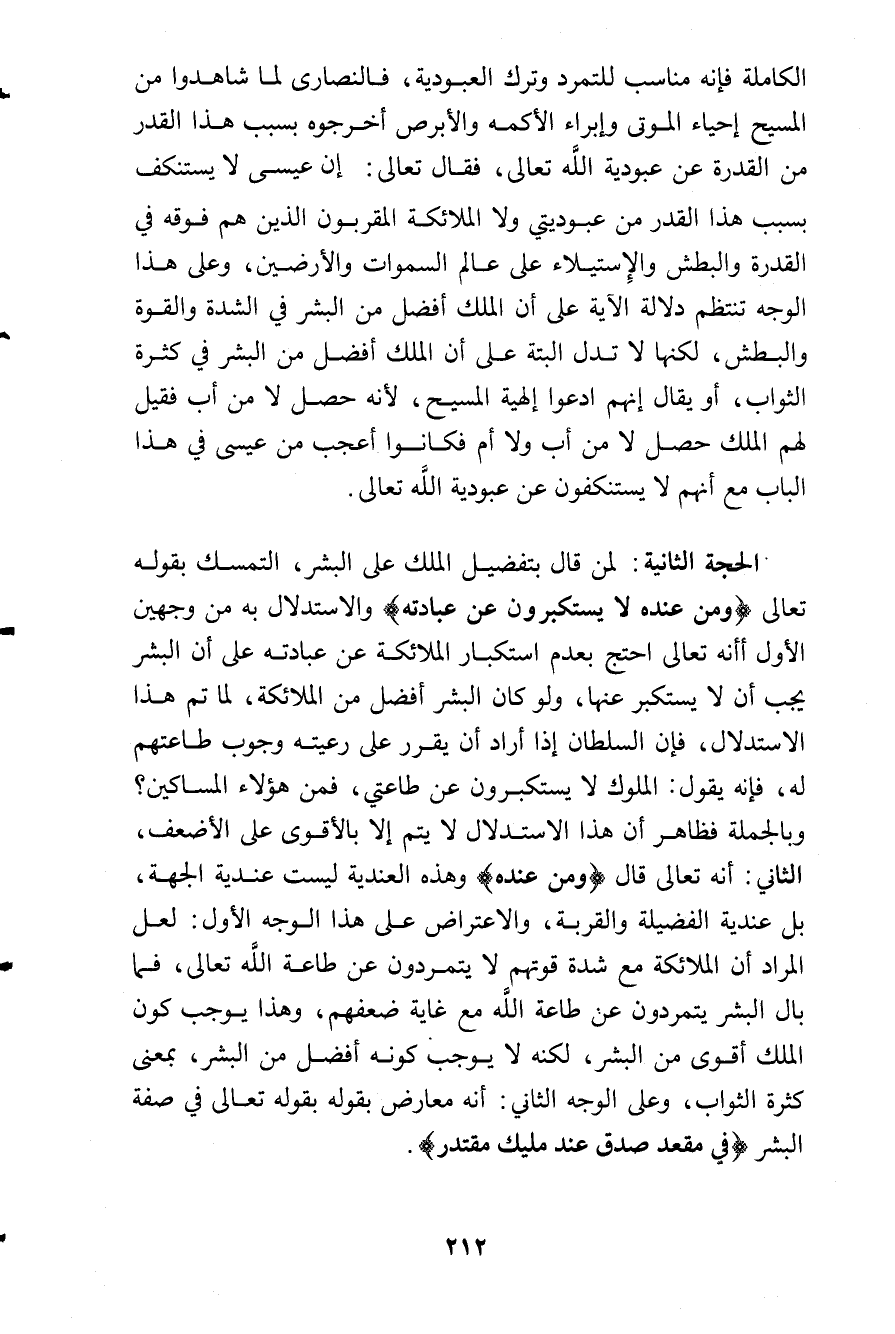 الكاملة فإنه مناسب للاتمرد وترك العبودية، فالنصارى لما شاهدوا من المسيح إحياء الموتى وإبراء الأكمه والأبرص أخرجوه بسبب هذا القدر عن عبودية الله تعالى، فقال تعالى: إن عيسى لا يستنكف بسبب هذا القدر عن عبوديتي ولا الملائكة المقربون الذين هم فوقه في القدرة والبطش والإستيلاء على عالم السموات والأرضين، وعلى هذا الوجه تنتظم دلالة الآية على ان الملك أفضل من البشر في الشدة والقوة والبطش، لكنها لا تدل ألبتة على أن الملك أفضل من البشر في كثرة الثواب، أو يقال إنهم إنما ادعوا إلهية المسيح، لأنه حصل لا من أب فقيل لهم: الملك حصل لا من أب ولا أم فكانوا أعجب من عيسى في هذا الباب مع أنهم لا يستنكفون عن عبودية الله تعالى.