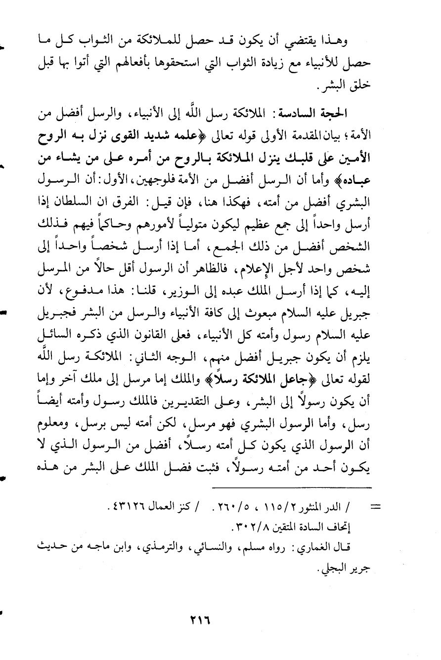 الحجة السادسة: الملائكة رسل الله إلى الأنبياء، والرسل أفضل من الأمة، بيان المقدمة الأولى قوله تعالى: (عَلَمَهُ شَدِيدُ القُوى) النجم:5 (َنزَلَ بِهِ الرُوحُ الأَمينُ عَلى قَلبِكَ) الشعراء: 193 (يُنَزِلُ المَلائِكَةَ بِالرُوحِ مِن أَمرِهِ عَلى مَن يَشاءُ مِن عِبادِهِ) النحل:2 وأما أن الرسل أفضل من الأمة فلوجهين؛ الأول: أن الرسول البشرى أفضل من أمته، فهكذا هنا، فإن قيل: الفرق أن السلطان إذا أرسل واحدا إلى جمع عظيم ليكون متوليا لأمورهم وحاكما فيهم فذلك الشخص أفضل من ذلك الجمع، أما إذا أرسل شخصا واحدا إلى شخص واحد لأجل الإعلام، فالظاهر أن الرسول أقل حالا من المرسل إليه، كما إذا أرسل الملك عبده إلى الوزير، قلنا: هذا مدفوع لأن جبريل عليه السلام مبعوث إلى كافة الأنبياء والرسل من البشر؛ فجبريل عليه السلام رسول، وأمته كل الأنبياء فعلى القانون الذي ذكره السائل يلزم أن يكون جبريل أفضل منهم. الوجه الثاني: الملائكة رسل الله لقوله تعالى: (جَاعِلُ المَلائِكَةِ رُسُلاً) فاطر: 1 والملك إما مرسل إلى ملك آخر، وإما أن يكون رسولا إلى البشر، وعلى التقديرين فالملك رسول وأمته أيضا رسل، وأما الرسول البشري فهو مرسل، لكن أمته ليس برسل، ومعلوم أن الرسول الذي يكون كل أمته رسلا، أفضل من الرسول الذي لا يكون أحد من أمته رسولا، فثبت فضل الملك على البشر من هذه