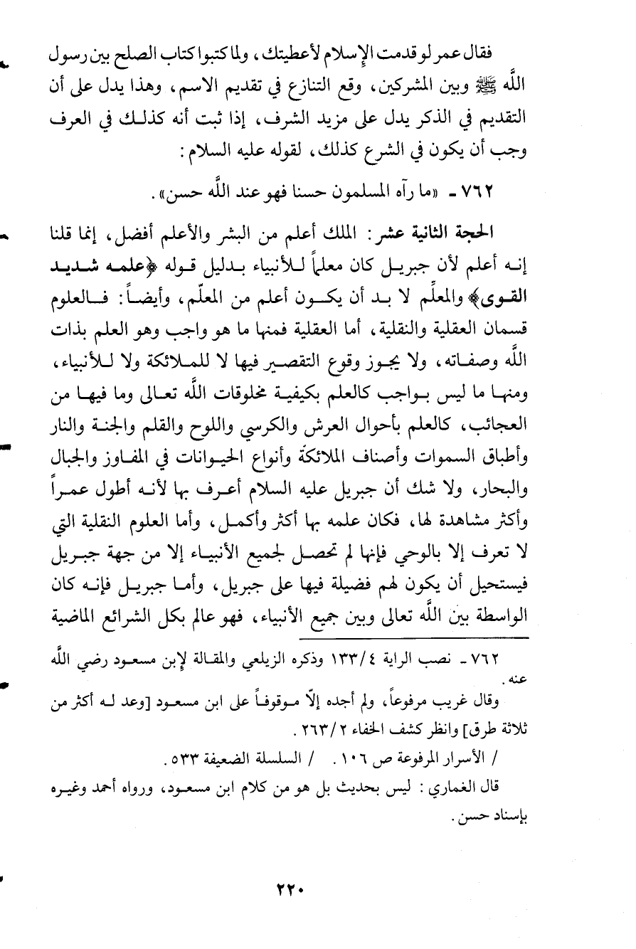 الحجة الثانية عشرة: الملك أعلم من البشر والأعلم أفضل، إنما قلنا إنه أعلم لأن جبريل كان معلما للأنبياء بدليل قوله: (عَلَمَهُ شَديدُ القُوى) النجم: 5 والمعلم لا بد أن يكون أعلم من المعلم، وأيضا: فالعلوم قسمان: العقلية والنقلية؛ أما العقلية فمنها ما هو واجب وهو العلم بذات الله وصفاته، ولا يجوز وقوع التقصير فيها لا للملائكة ولا للأنبياء، ومنها ما ليس بواجب كالعلم بكيفية مخلوقات الله تعالى ومافيها من العجائب، كالعلم بأحوال العرش والكرسي واللوح والقلم والجنة والنار وأطباق السموات وأصناف الملائكة وأنواع الحيوانات في المفاوز والجبال والبحار، ولا شك أن جبريل عليه السلام أعرف بها لأنه أطول عمرا وأكثر مشاهدة لها، فكان علمه بها أكثر وأكمل، وأما العلوم النقلية التي لا تعرف إلا بالوحي فإنها لم تحصل لجميع الأنبياء إلا من جهة جبريل فيستحيل أن يكون لهم فضيلة فيها على جبريل، وأما جبريل فإنه كان الواسطة بين الله تعالى وبين جميع الأنبياء، فهو عالم بكل الشرائع الماضية