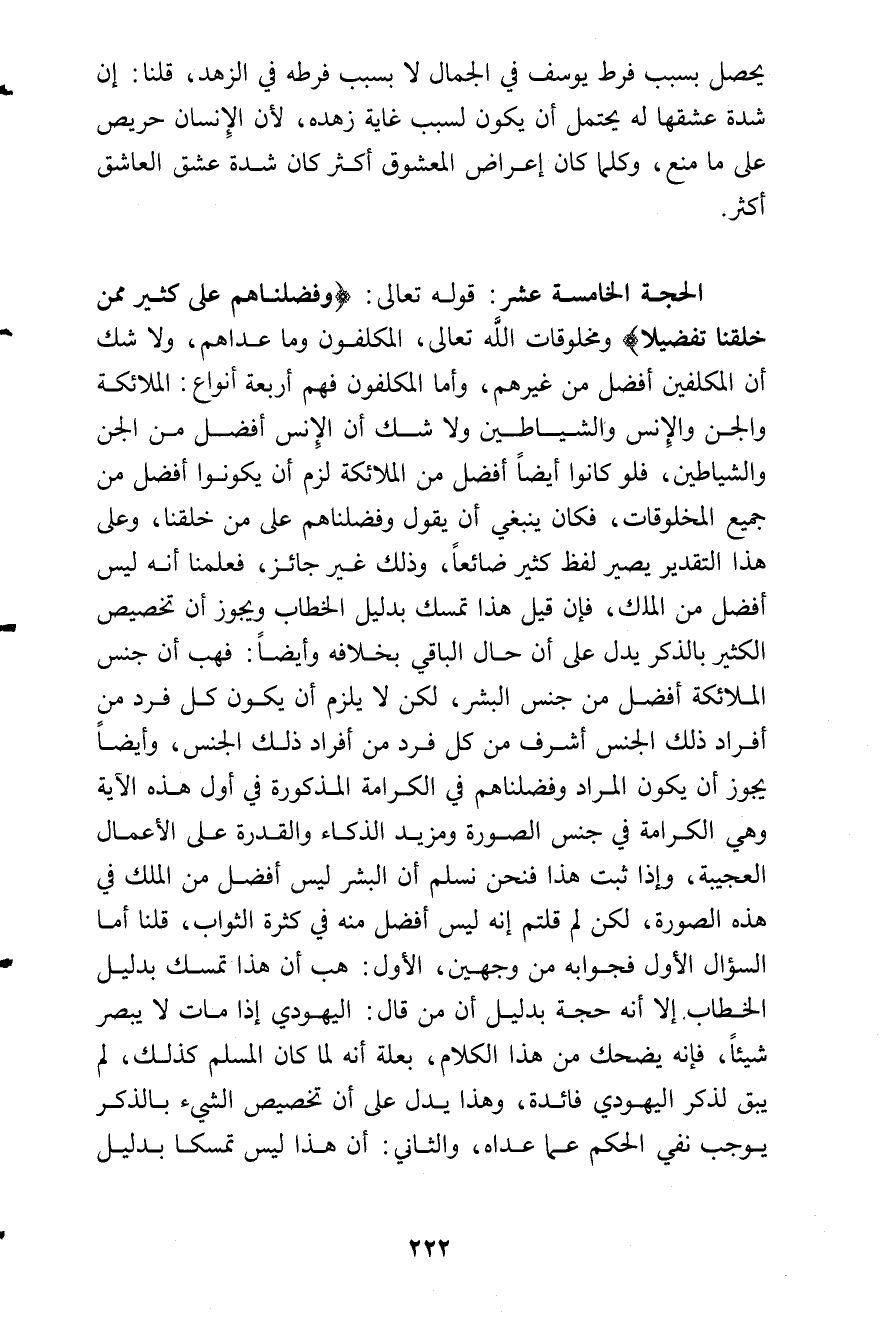 قوله تعالى: (وَفَضلَناهُم عَلى كَثَيرٍ مِمَن خَلَقَنا تَفضِيلاً) الإسراء: 70 ومخلوقات الله تعالى: المكلفون وما عداهم، ولا شك أن المكلفين أفضل من غيرهم، وأما المكلفون فهم أربعة أنواع: الملائكة والجن والإنس والشياطين؛ ولا شك أن الإنس أفضل من الجن والشياطين، فلو كانوا أيضا أفضل من الملائكة لزم أن يكونوا أفضل من جميع المخلوقات فكان ينبغي أن يقول: وفضلناهم على من خلقنا، وعلى هذا التقدير يصير لفظ كثير ضائعا، وذلك غير جائر، فعلمنا أنه ليس أفضل من الملك، فإن قيل: هذا تمسك بدليل الخطاب ويجوز أن تخصيص الكثير بالذكر يدل على أن حال الباقي بخلافه وأيضا: فهب أن جنس الملائكة أفضل من جنس البشر، لكن لا يلزم أن يكون كل فرد من أفراد ذلك الجنس أشرف من كل فرد من أفراد ذلك الجنس، وأيضا يجوز أن يكون المراد: وفضلناهم في الكرامة المذكورة في أول هذه الآية وهي الكرامة في جنس الصورة ومزيد الذكاء والقدرة على الأعمال العجيبة، وإذا ثبت هذا فنحن نسلم أن البشر ليس أفضل من الملك في هذه الصورة، لكن لم قلتم إنه ليس أفضل منه في كثرة الثواب؟ قلنا: أما السؤال الأول فجوابه من وجهين، الأول: هب أن هذا تمسك بدليل الخطاب غلا أنه حجة بدليل أن من قال: اليهودي إذا مات لا يبصر شيئا، فإنه يضحك من هذا الكلام، بعلة أنه لما كان المسلم كذلك، لم يبق لذكر اليهودي فائدة، وهذا يدل على أن تخصيص الشيء بالذكر يوجب نفي الحكم عما عداه، والثاني: أن هذا ليس تمسكا بدليل