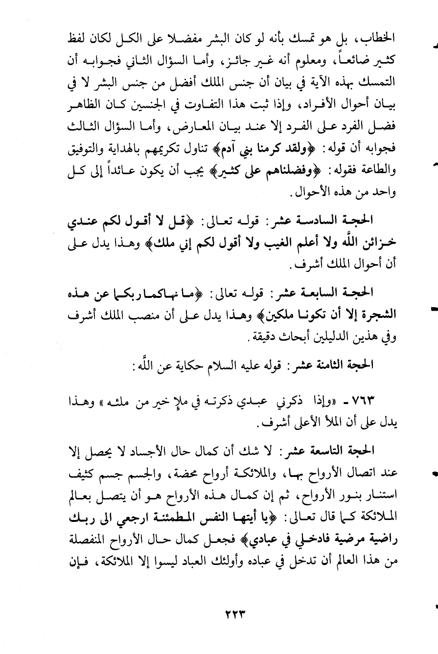 الحجة السابعة عشرة: قوله تعالى: (ما نَهاكُم رَبُكُما عَن هَذَهِ الشَجَرَةِ إِلا أَن تَكونَ مَلَكَينِ) الأعراف: 20 وهذا يدل على أن منصب الملك أشرف وفي هذين الدليلين ابحاث دقيقة.