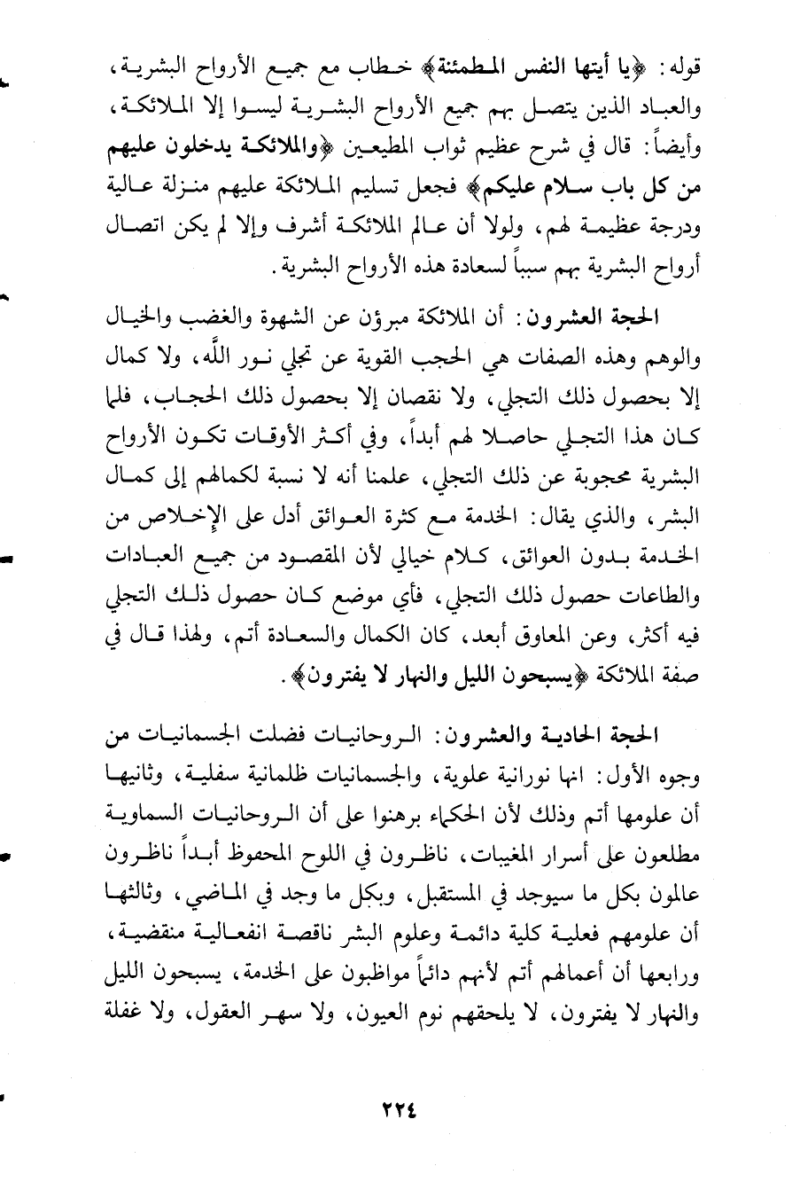 قوله (يَأَيَتُها النَّفسُ المُطمَئِنَّة) خطاب مع جميع الأرواح البشرية، والعباد الذين يتصل بهم جميع الأرواح البشرية ليسوا إلا الملائكة، وأيضا: قال في شرح عظيم ثواب المطيعين: (وَالمَلائِكَةُ يَدخُلُونَ عَلَيهِم مِن كُلِ بابٍ سَلاٌم عَلَيكُم) الرعد: 23، 24 فجعل تسليم الملائكة عليهم منزلة عالية ودرجة عظيمة لهم، ولولا أن عالم الملائكة أشرف وإلا لم يكن اتصال أرواح البشرية بهم سببا لسعادة هذه الأرواح البشرية.