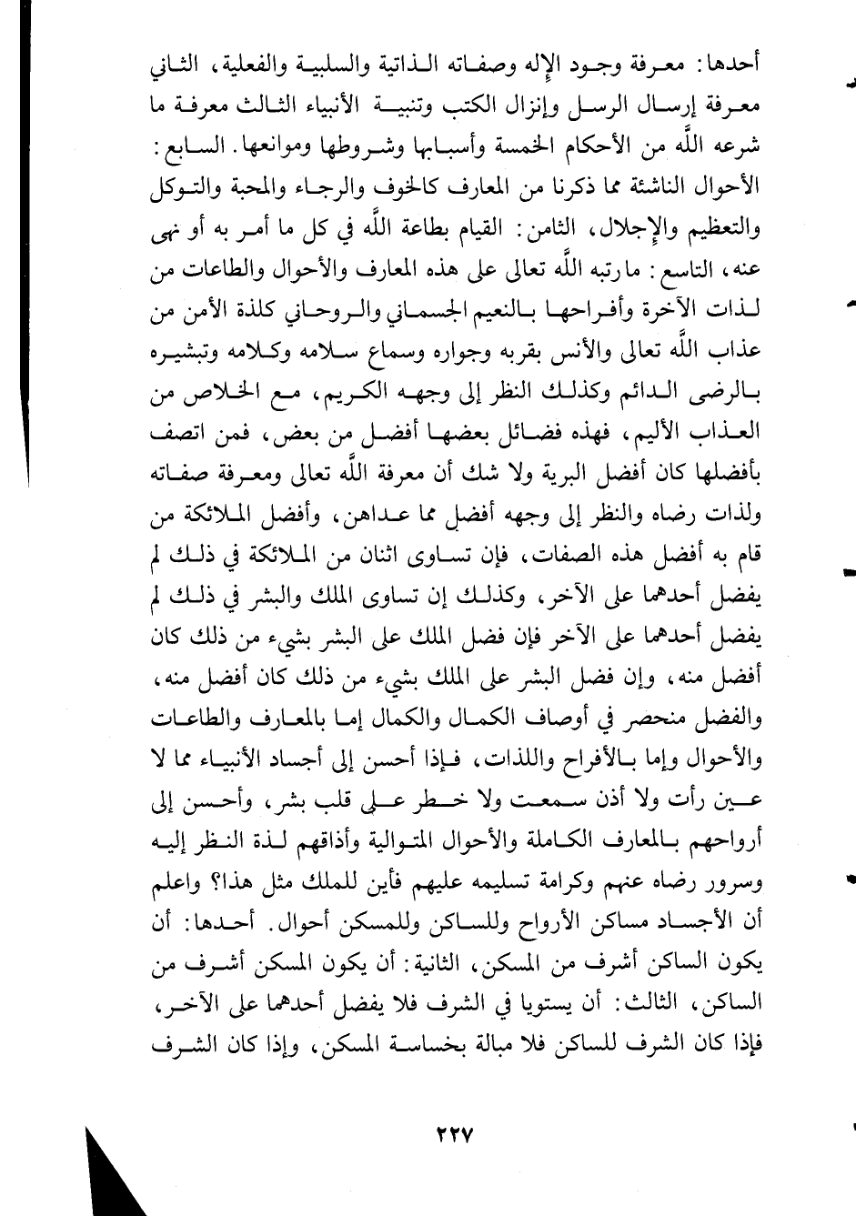 والثاني: معرفة إرسال الرسل وإنزال الكتب وتنبيه الأنبياء، الثالث: معرفة ما شرعه الله من الأحكام الخمسة وأسبابها، وشروطها، وموانعها، السابع: الأحوال الناشئة مما ذكرنا من المعارف: كالخوف والرجاء والمحبة والتوكل، والتعظيم، والإجلال، الثامن: القيام بطاعة الله في كل ما أمر به أونهى عنه.