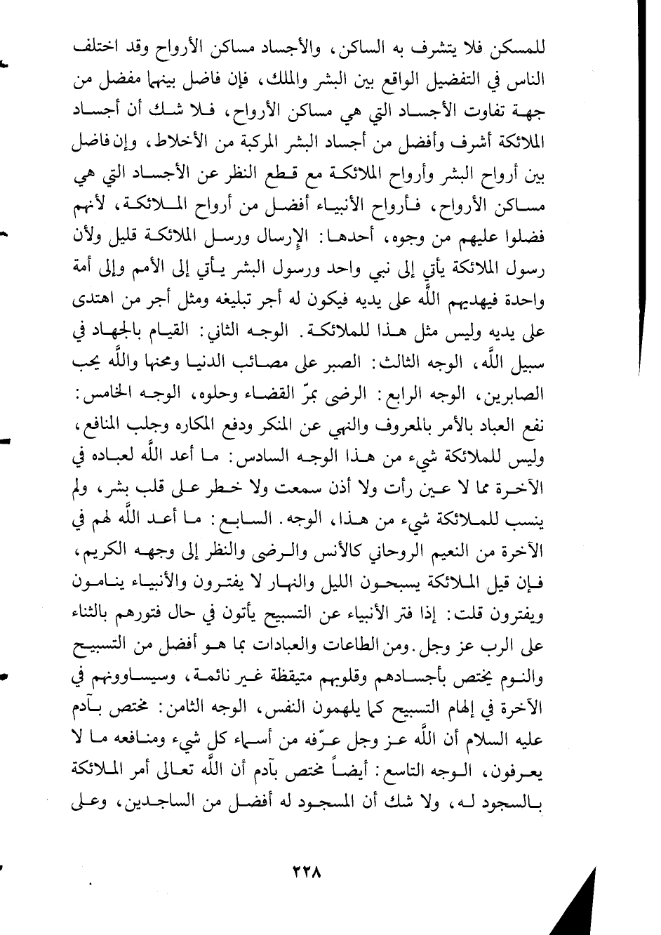 للمسكن فلا يتشرف به الساكن، والأجساد مساكن الأرواح وقد اختلف الناس في التفضيل الواقع بين البشر والملك، فإن فاضل بينهما مفضل من جهة تفاوت الأجساد التي هي مساكن الأرواح، فلا شك أن أجساد الملائكة أشرف وأفضل من أجساد البشر المركبة من الأخلاط، وإن فاضل بين أرواح البشر وأرواح الملائكة مع قطع النظر عن الأجساد التي هي مساكن الأرواح. فأرواح الأنبياء أفضل من أرواح الملائكة، لأنهم فضلوا عليهم من وجوه: الإرسال ورسل الملائكة قليل؛ ولأن رسول الملائكة يأتي إلى نبي واحد ورسول البشر يأتي إلى الأمم وإلى أمة واحدة فيهديهم الله على يديه فيكون له أجر بتبليغه ومثل أجر من اهتدى على يديه وليس مثل هذا للملائكة. الوجه الثاني: القيام بالجهاد في سبيل الله، الوجه الثالث: الصبر على مصائب الدنيا ومحنها والله يحب الصابرين، الوجه الرابع: الرضى بمر القضاء وحلوه، الوجه الخامس: نفع العباد بالأمر بالمعروف والنهي عن المنكر ودفع المكاره وجلب المنافع، وليس للملائكة شيء من هذا. الوجه السادس: ما أعده الله لعباده في الآخرة مما لا عين رأت ولا اذن سمعت ولا خطر على قلب بشر، ولم ينسب للملائكة شيء من هذا، الوجه السابع: ما أعد الله لهم في الآخرة من النعيم الروحاني كالأنس الرضى والنظر إلى وجهه الكريم، فإن قيل الملائكة يسبحون الليل والنهار لا يفترون والأنبياء ينامون ويفترون، قلت: إذا فتر الأنبياء عن التسبيح يأتون في حال فتورهم بالثناء على الرب عز وجل ومن الطاعات والعبادات بما هو أفضل من التسبيح والنوم يختص بأجسادهم وقلوبهم متيقظى غير نائمة، وسيساوونهم في الآخرة في إلهام التسبيح كما يلهمون النفس، الوجه الثامن: مختص بآدم عليه السلام أن الله عز وجل عرفه من أسماء كل شيء ومنافعه مالا يعرفون، الوجه التاسع: أيضا مختص بآدم أن الله تعالى أمر الملائكة بالسجود له، ولا شك أن المسجود له أفضل من الساجدين، وعلى