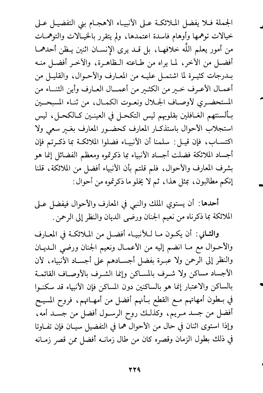 والأحوال، والقليل من أعمال الأعرف خير من الكثير من أعمال العارف وأين الثناء من المستحضرين لأوصاف الجلال ونعوت الكمال من ثناء المسبحين بألسنتهم الغافلين بقلوبهم ليس التكحل في العينين كالكحل، ليس استجلاب الأحوال باستذكار المعارف كحضور المعارف بغير سعي ولا اكتساب، فإن قيل: سلمنا أن الأنبياء فضلوا الملائكة بما ذكرتم فإن أجساد الملائكة فضلت أجساد الأنبياء بما ذكرتموه ومعظم الفضائل إنما هو بشرف المعارف والأحوال فلم قلتم بأن الأنبياء أفضل من الملائكة؟ قلنا: إنكم مطالبون بمثل هذا، ثم لا يخلو ما ذكرتموه من أحوال.