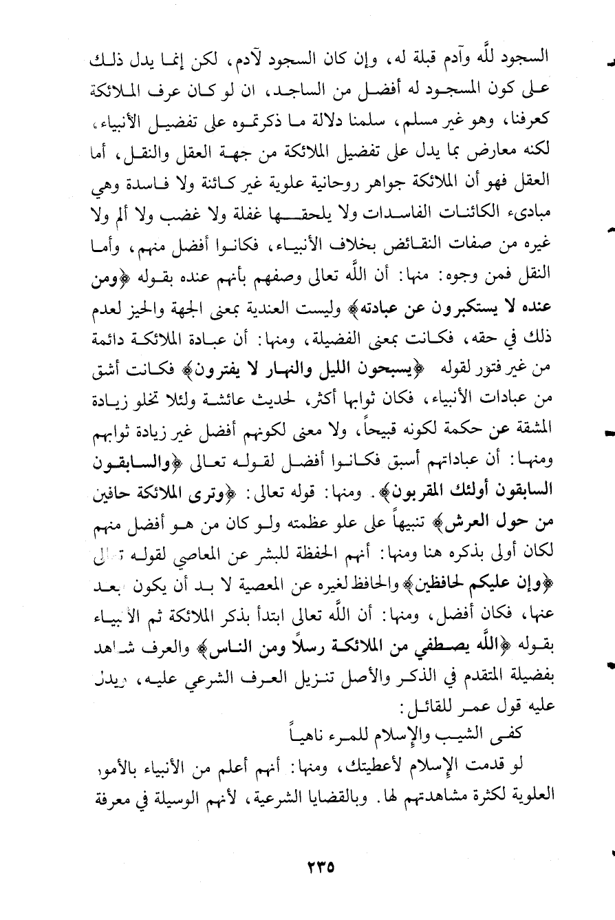 السجود لله وآدم قبلة لاه، وإن كان السجود لآدم، لكن إنما يدل ذلك على كون المسجود له أفضل من الساجد، أن لو كان عرف الملائكة كعرفنا، وهو غير مسلم، سلمنا دلالة ما ذكرتموه على تفضيل الأنبياء، لكنه معارض مما يدل على تفضيل الملائكة من جهة العقل والنقل، أما العقل: فهو أن الملائكة جواهر روحانية علوية غير كائنة ولا فاسدة وهي مبادىء الكائنات الفاسدات ولا يلحقها غفلة ولا غضب ولا ألم ولا غيره من صفات النقائض بخلاف الأنبياء، فكانوا افضل منهم، وأما النقل فمن وجوه، منها: أن الله تعالى وصفهم بأنهم عنده بقوله: (وَمَن عِندَهُ لاَ يَستَكبِرُونَ عَن عِبادَتِهِ) الأنبياء: 19 وليست العندية بمعنى الجهة والحيز لعدم ذلك في حقه، فكانت بمعنى الفضيلة، ومنها: أن عبادة الملائكة دائمة من غير فتور لقوله: (يُسَبِحُونَ اللَيلَ وَالنَّهارَ لاَ يَفتَرُونَ) الأنبياء: 20 فكانت اشق من عبادات الأنبياء، فكان ثوابها أكثر لحديث عائشة ولئلا تخلو زيادة المشقة عن حكمة لكونه قبيحا، ولا معنى لكونهم أفضل غير زيادة ثوابهم ومنها: أن عباداتهم أسبق فكانوا أفضل لقوله تعالى: (وَالسابِقُونَ السَابِقُونَ أَولَئِكَ المُقَرَبونَ) الواقعة: 10، 11ومنها: قوله تعالى: (وَتَرَى المَلائِكَةَ حافِينَ مِن حَولِ العَرشِ) الزمر: 75 تنبيهاعلى علو عظمته ولو كان من هو أفضل منهم لكان أولى بذكره هنا ومنها: انهم الحفظة للبشر عن المعاصي لقوله تعالى: (وَإِنَّ عَلَيكُم لَحَافِظِين) الإنفطار: 10 والحافظ لغيره عن المعصية لا بد أن يكون أبعد عنها فكان أفضل، ومنها: أن الله تعالى ابتدأ بذكر الملائكة ثم الأنبياء بقوله: (الله يَصطَفَى مِنَ المَلائِكَةِ رُسُلاً وَمِنَ النَّاسِ) الحج: 75 والعرف شاهد بفضيلة المتقدم في الذكر والأصل تنزيل العرف الشرعي عليه، ويدل عليه قول عمر للقائل:........................... كفى الشيب والإسلام للمرء ناهيا