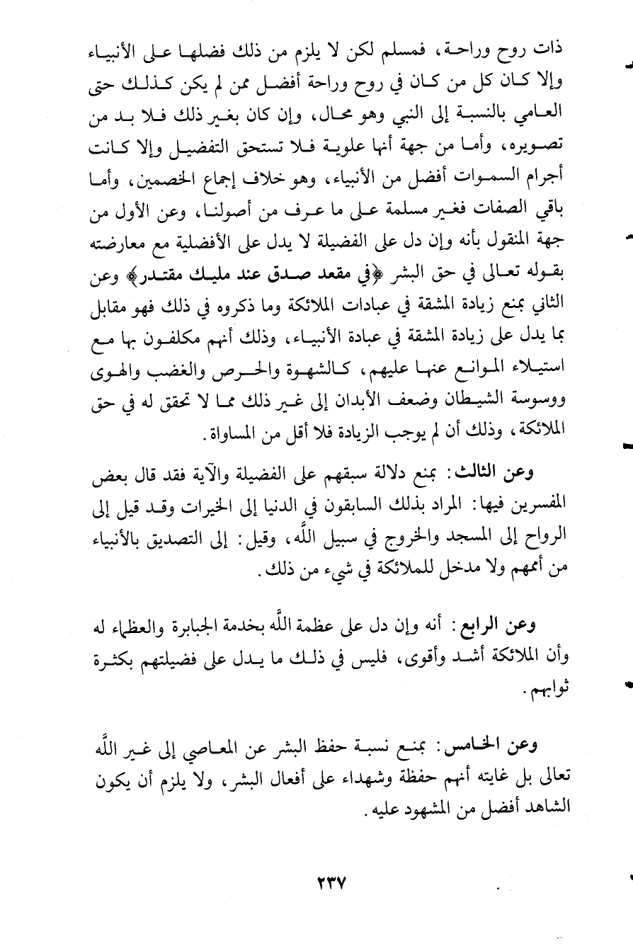 وعن الأول: من جهة المنقول بأنه وإن دل على الفضيلة لا يدل على الأفضلية مع معارضته بقوله تعالى في حق البشر: (فَي مَقعَدِ صِدقٍ عِندَ مَلِيكٍ مُقتَدِر) القمر:55 وعن الثاني: بمنع زيادة المشقة في عبادات الملائكة وما ذكروه في ذلك فهو مقابل بما يدل على زيادة المشقة في عبادة الأنبياء، وذلك أنهم مكلفون بها مع استيلاء الموانع عنها عليهم، كالشهوة والحرص والغضب والهوى، ووسوسة الشيطان وضعف الأبدان إلى غير ذلك مما لا تحقق له في حق الملائكة، وذلك إن لم يوجب الزيادة فلا أقل من المساواة.