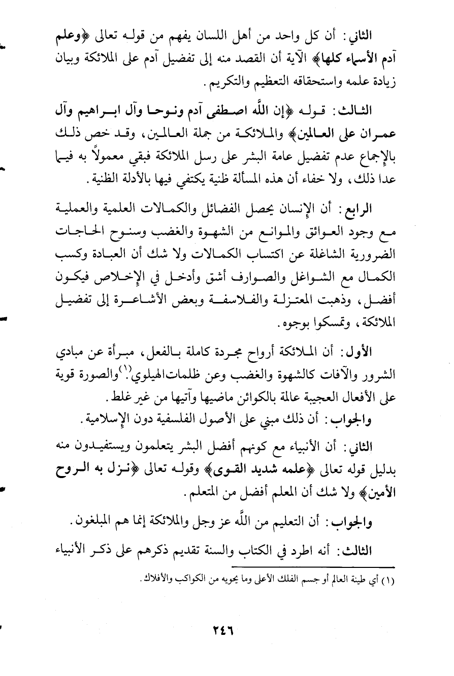 - الثالث: قوله (إِنَّ الله اِصطَفى آَدَمَ وَنُوحاً وَآَلَ إِبرَاهِيمَ وِآَلَ عِمرَان عَلَى العالِمينَ) آل عمران: 33 والملائكة من جملة العالمين، وقد خص ذلك بالإجماع عدم تفضيل عامة البشر على رسل الملائكة فبقى معمولا به فيما عدا ذلك، ولاخفاء ان هذه المسألة ظنية يكتفي فيها بالأدلة الظنية.