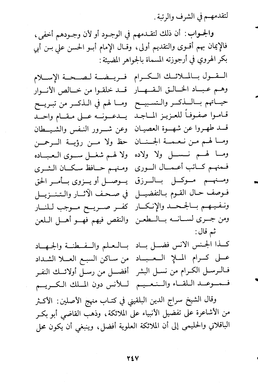 وقال الشيخ سراج الدين البلقيني في كتاب منهج الأصلين: الأكثر من الأشاعرة على تفضيل الأنبياء على الملائكة، وذهب القاضي أبو بكر الباقلاني والحليمي إلى أن الملائكة العلوية أفضل، وينبغي أن يكون محل
