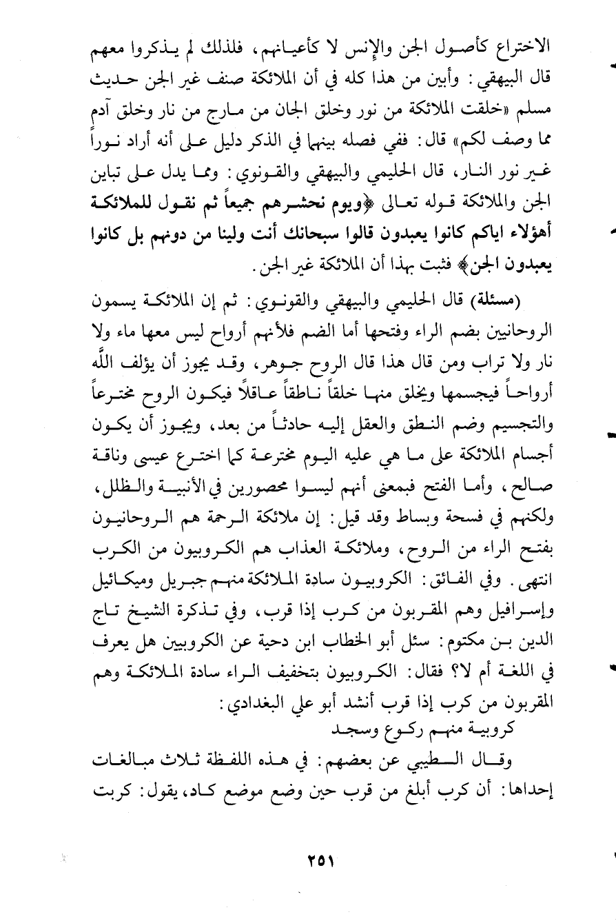 قال الحليمي والبيهقي والقونوي: ثم إن الملائكة يسمون الروحانيين بضم الراء وفتحها؛ أما الضم فلأنهم أرواح ليس معها ماء ولا نار ولا تراب، ومن قال هذا قال: الروح جوهر، وقد يجوز أن يؤلف الله أرواحا فيجسمها ويخلق منها خلقا ناطقا عاقلا فيكون الروح مخترعا والتجسيم وضم النطق والعقل إليه حادثا من بعد، ويجوز أن يكون أجسام الملائكة على ماهي عليه اليوم مخترعة كما اخترع عيسى وناقة صالح، وأما الفتح فبمعنى أنهم ليسوا محصورين في الأبنية والظلل، ولكنهم في فسحة وبساط وقد قيل: إن ملائكة الرحمة هم الروحانيون بفتح الراء من الروح، وملائكة العذاب هم الكروبيون من الكرب انتهى، وفي الفائق: الكروبيون سادة الملائكة منهم جبريل وميكائيل وإسرافيل وهم المقربون من كرب إذا قرب، وفي تذكرة الشيخ تاج الدين ابن مكتوم: سئل أبو الخطاب بن دحية عن الكروبيين هل يعرف في اللغة أم لا؟ فقال: الكروبيون بتخفيف الراء سادة الملائكة وهم المقربون من كرب إذا قرب أنشد أبو علي البغدادي: كروبية منهم ركوع وسجد. وقال الطيبي عن بعضهم: في هذه اللفظة ثلاث مبالغات إحداها: إن كرب أبلغ من قرب حين وضع موضع كاد، يقول كربت