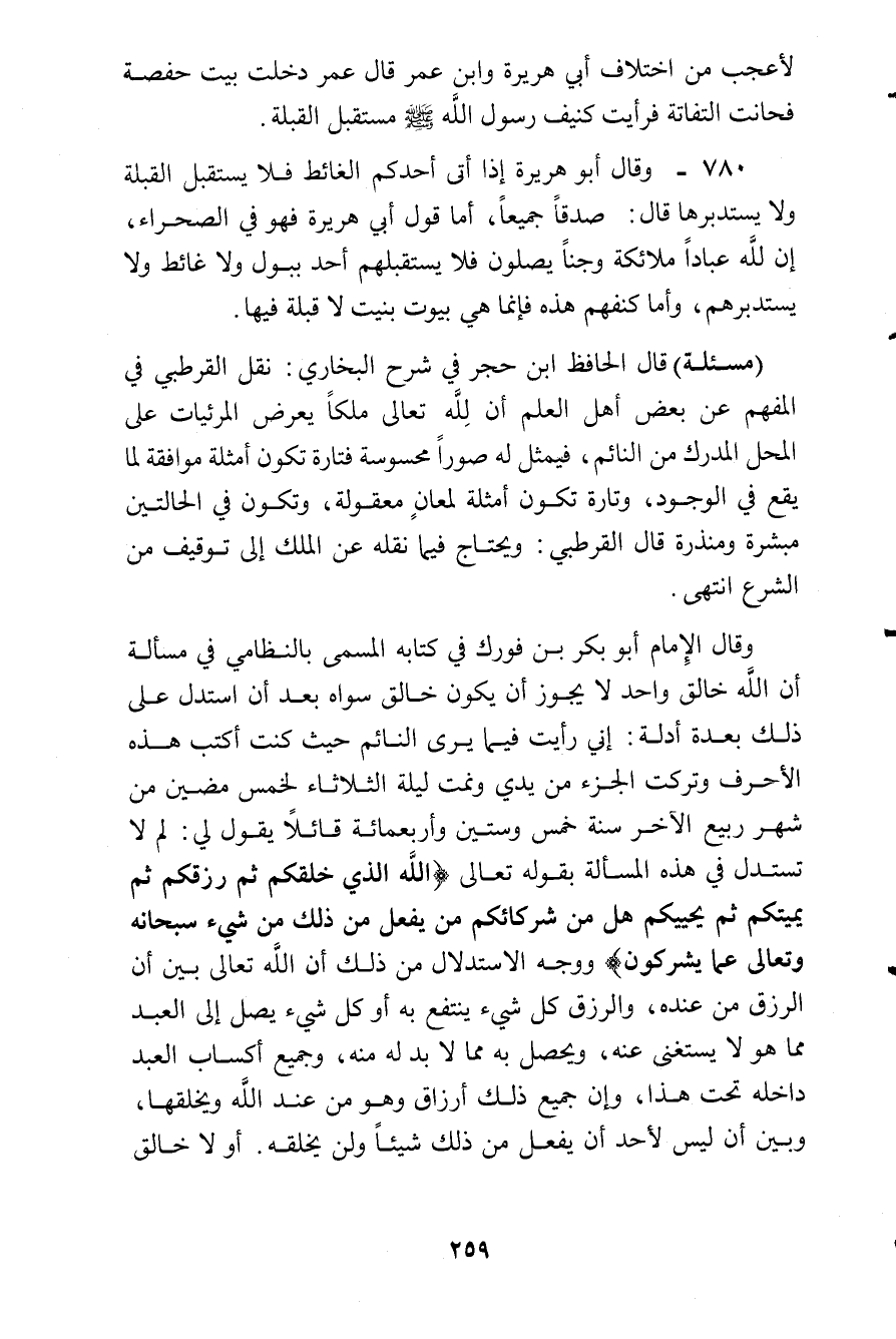 وقال الإمام أبو بكر بن قورك في كتابه المسمى بالنظامي في مسألة: ان الله تعالى خالق واحد لا يجوز أن يكون خالق سواه، بعد أن استدل على ذلك بعدة أدلة: إني رأيت فيما يرى النائم حيث كنت أكتب هذه الأحرف وتركت الجزء من يدي ونمت ليلة الثلاثاء لخمس مضين من شهر ربيع الآخر سنة خمس وستين وأربعمائة قائلا يقول لي: لم لا تستدل في هذه المسألة بقوله تعالى: (الله الَّذي خلَقَكُم ثُمَّ رَزَقَكُم ثُمَّ يُمِيتُكُم ثُمَّ يُحيِيِكُم هَل مِن شُرَكائِكُم مِن يَفعَلُ مِن ذَلِكُم مِن شَيء سُبحانَهُ وَتَعالَى عَمَّا يُشرِكُونَ (الروم: 40 ووجه الإستدلال من ذلك أن الله تعالى بين أن الرزق من عنده، والرزق كل شيء ينتفع به أو كل شيء يصل إلى العبد مما هو لا يستغني عنه، ويحصل به مما لا بد له منه، وجميع أكساب العبد داخله تحت هذا، وإن جميع ذلك أرزاق وهو من عند الله ويخلقها، وبين أن ليس لأحد أن يفعل من ذلك شيئا ولن يخلقه. أو لا خالق