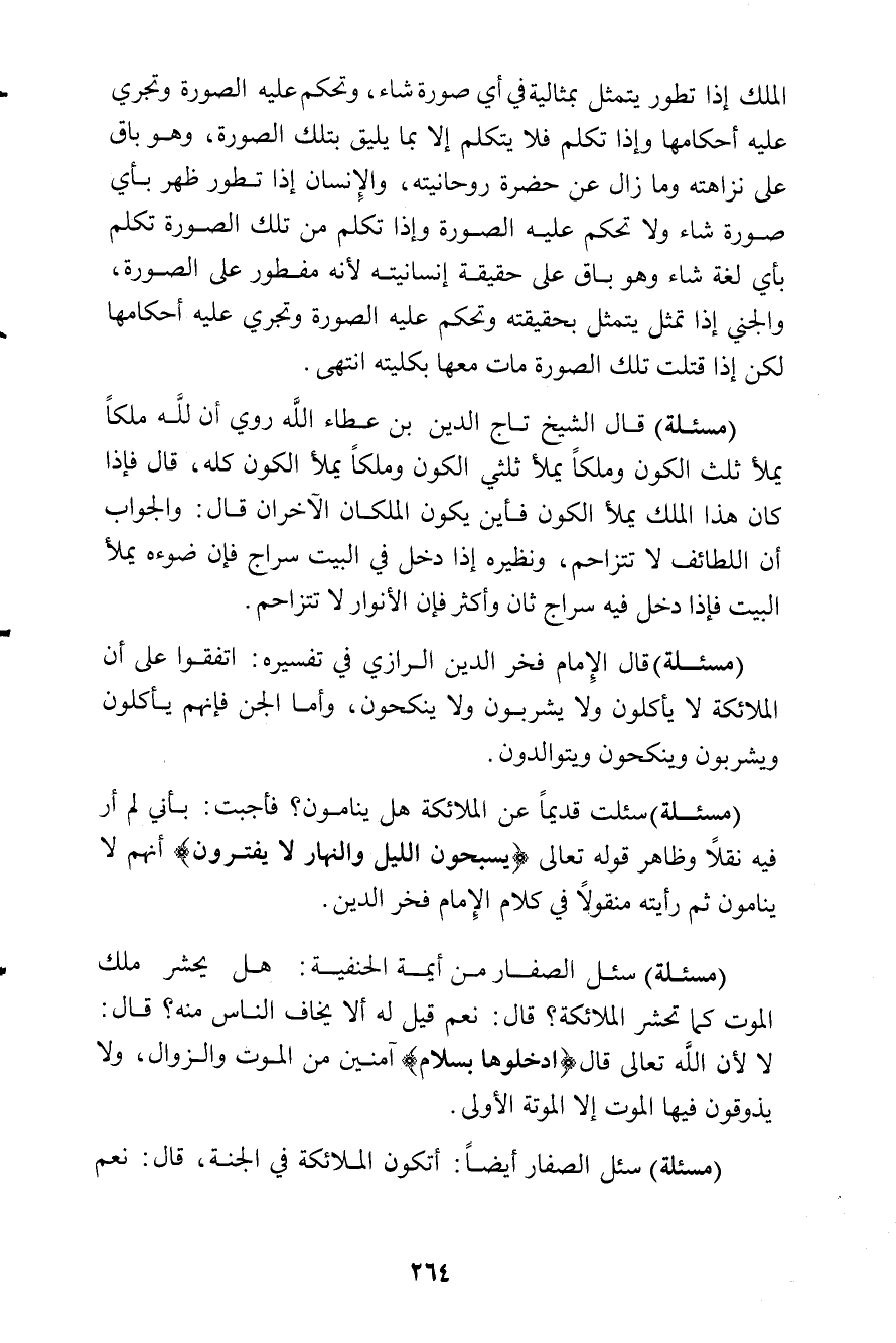 الملك إذا تطور يتمثل بمثالية في أي صورة شاء، وتحكم عليه الصورة وتجري عليه أحكامها وإذا تكلم فلا يتكلم إلا بما يليق بتلك الصورة، وهو باق على نزاهته ومازال عن حضرة روحانيته، والإنسان إذا تطور ظهر بأي صورة شاء ولا تحكم عليه الصورة، وإذا تكلم من تلك الصورة تكلم بأي لغة شاء وهو باق على حقيقة إنسانيته لأنه مفطور على الصورة، والجني إذا تمثل يتمثل بحقيقته وتحكم عليه الصورة وتجري عليه أحكامها لكن إذا قتلت تلك الصورة مات معها بكليته. انتهى.