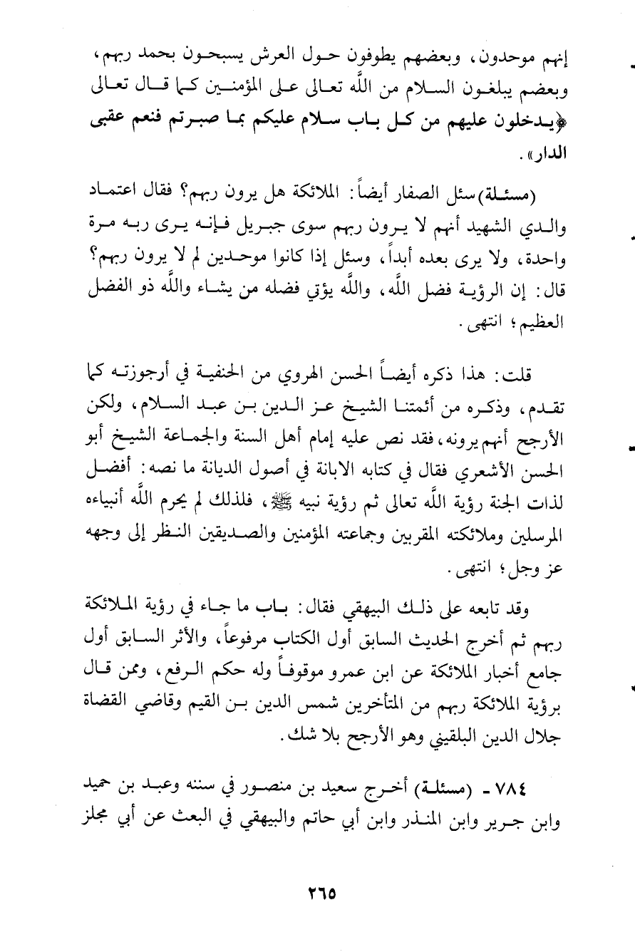 وقد تابعه على ذلك البيهقي فقال: باب ما جاء في رؤية الملائكة ربهم ثم أخرج الحديث السابق أول الكتاب مرفوعا، والأثر السابق أول جامع أخبار الملائكة عن ابن عمرو موقوفا، وله حكم الرفع، وممن قال برؤية الملائكة ربهم من المتأخرين شمس الدين بن القيم وقاضى القضاة جلال الدين البلقيني، وهو الأرجح بلا شك.