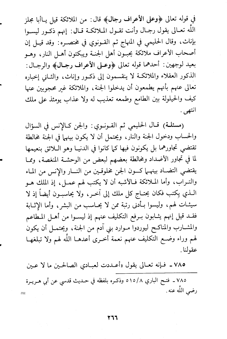 في قوله تعالى: (وَعَلى الأَعرافِ رِجالُ) الأعراف: 46 قال: من الملائكة قيل: يا أبا مجلز الله تعالى يقول: رجال وأنت تقول: الملائكة قال: إنهم ذكورا ليسوا بإناث، وقال الحليمي في المنهاج ثم القونوي في مختصره: وقد قيل إن أصحاب الأعراف ملائكة يحبون أهل الجنة ويبكتون أهل النار، وهو بعيد لوجهين: أحدهما قوله تعالى (وَعَلى الأَعرافِ رِجالُ) والرجال: الذكور العقلاء، والملائكة لا ينقسمون إلى ذكور وإناث، والثاني إخباره تعالى عنهم وأنهم يطمعون أن يدخلوا الجنة، ولالمائكة غير محجوبين عنها كيف والحيلولة بين الطامع وطمعه تعذيب له ولا عذاب يومئذ على ملك. انتهى.