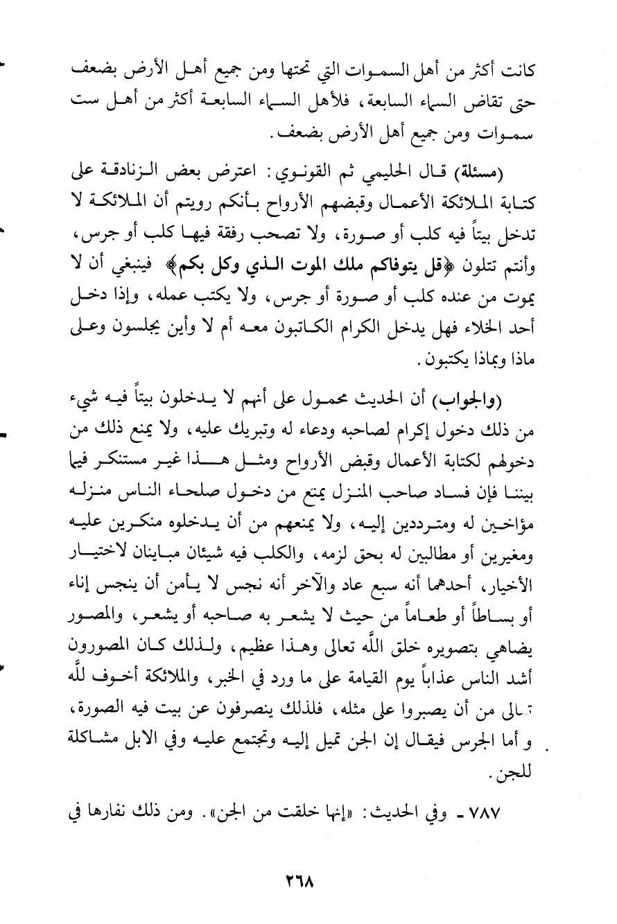 قال الحليمي ثم القونوي: اعترض بعض الزنادقة على كتابة الملائكة الأعمال وقبضهم الأرواح بأنكم رويتم أن الملائكة لا تدخل بيتا فيه كلب أو صورة، ولا تصحب رفقة فيها كلب أو جرس، وأنتم تتلون: (قُل يَتَوفاكُم مَلَكُ المَوتِ الذي وُكِلَ بِكُم) السجدة: 11 فينبغي أن لا يموت من عنده كلب أو صورة أو جرس، ولا يكتب عمله، وإذا دخل أحد الخلاء فهل يدخل الكرام الكاتبون معه أم لا؟ وأين يجلسون؟ وعلى ماذا؟ وبماذا يكتبون؟