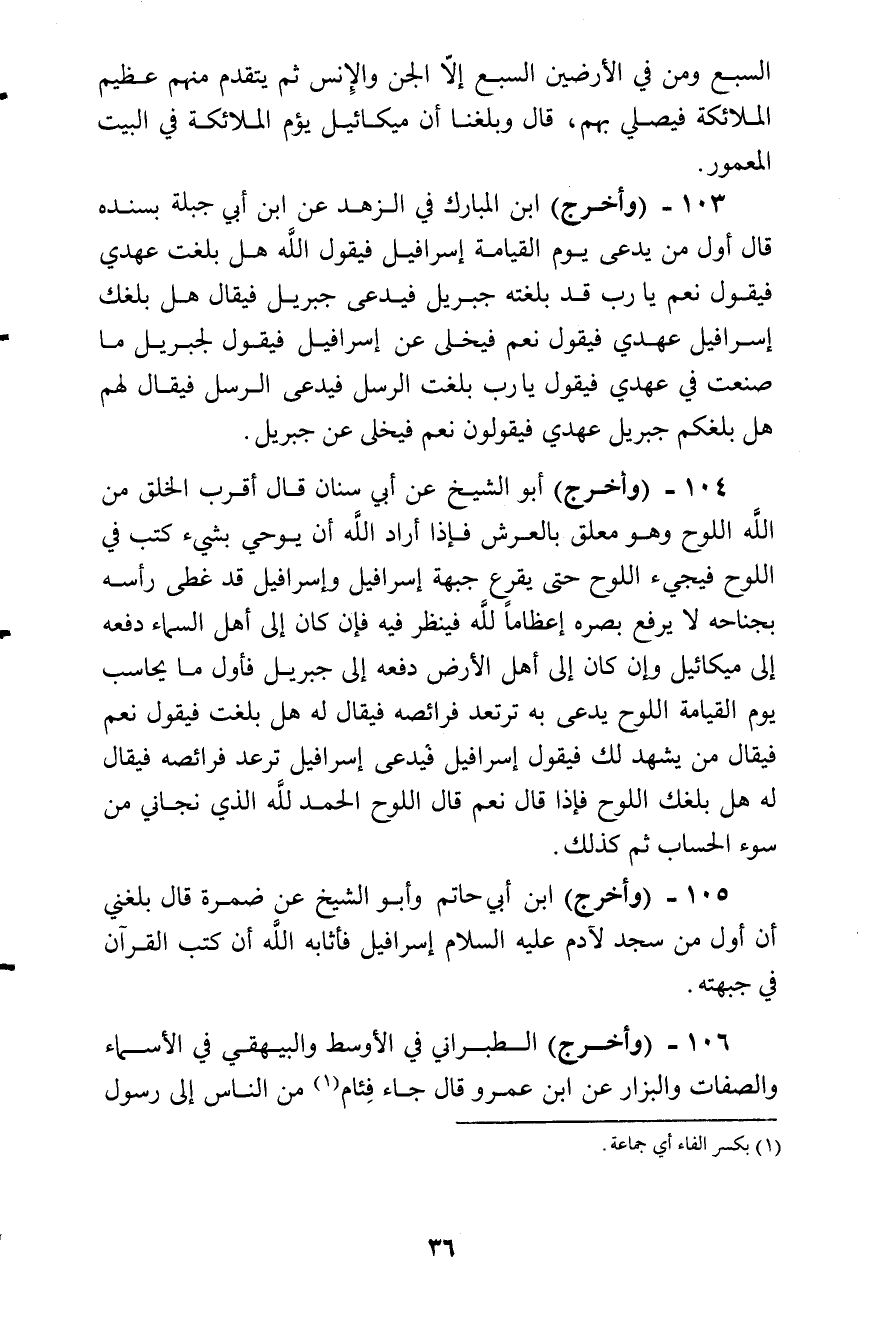 وأخرج ابن المبارك في الزهد عن ابن أبى جبلة بسنده قال: أول من يدعى يوم القيامة إسرافيل فيقول الله: هل بلغت عهدى؟ فيقول: نعم يارب قد بلغته جبريل فيدعى جبريل فيقال: هل بلغك إسرافيل عهدى؟ فيقول: نعم فيخلى عن إسرافيل فيقول لجبريل: ما صنعت في عهدى فيقول: يا رب بلغت الرسل فيدعى الرسل فيقال لهم: هل بلغكم جبريل عهدي؟ فيقولون: نعم فيخلى عن جبريل.