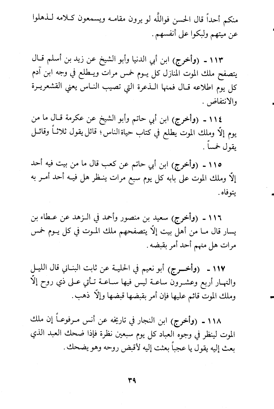 وأخرج سعيد بن منصور، وأحمد في الزهد عن عطاء بن يسار قال: ما من أهل بيت إلا يتصفحهم ملك الموت في كل يوم خمس مرات هل منهم أحد أمر بقبضه.