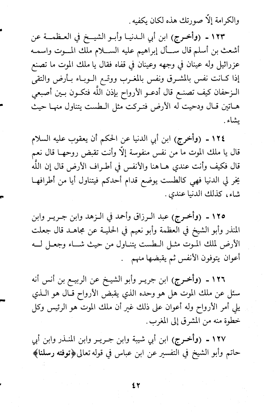 وأخرج ابن أبى الدنيا، وأبو الشيخ في العظمة عن أشعث بن أسلم قال: سأل إبراهيم عليه السلام ملك الموت وإسمه عزرائيل، وله عينان في وجهه، وعينان في قفاه فقال: يا ملك الموت؟ ما تصنع إذا كانت نفس بالمشرق ونفس بالمغرب؟ ووقع الوباء بأرض والتقى الزحفان كيف تصنع؟ قال: أدعو الأرواح بإذن الله فتكون بين أصبعي هاتين قال: ودحيت له الأرض فتركت مثل الطست يتناول منها حيث يشاء.