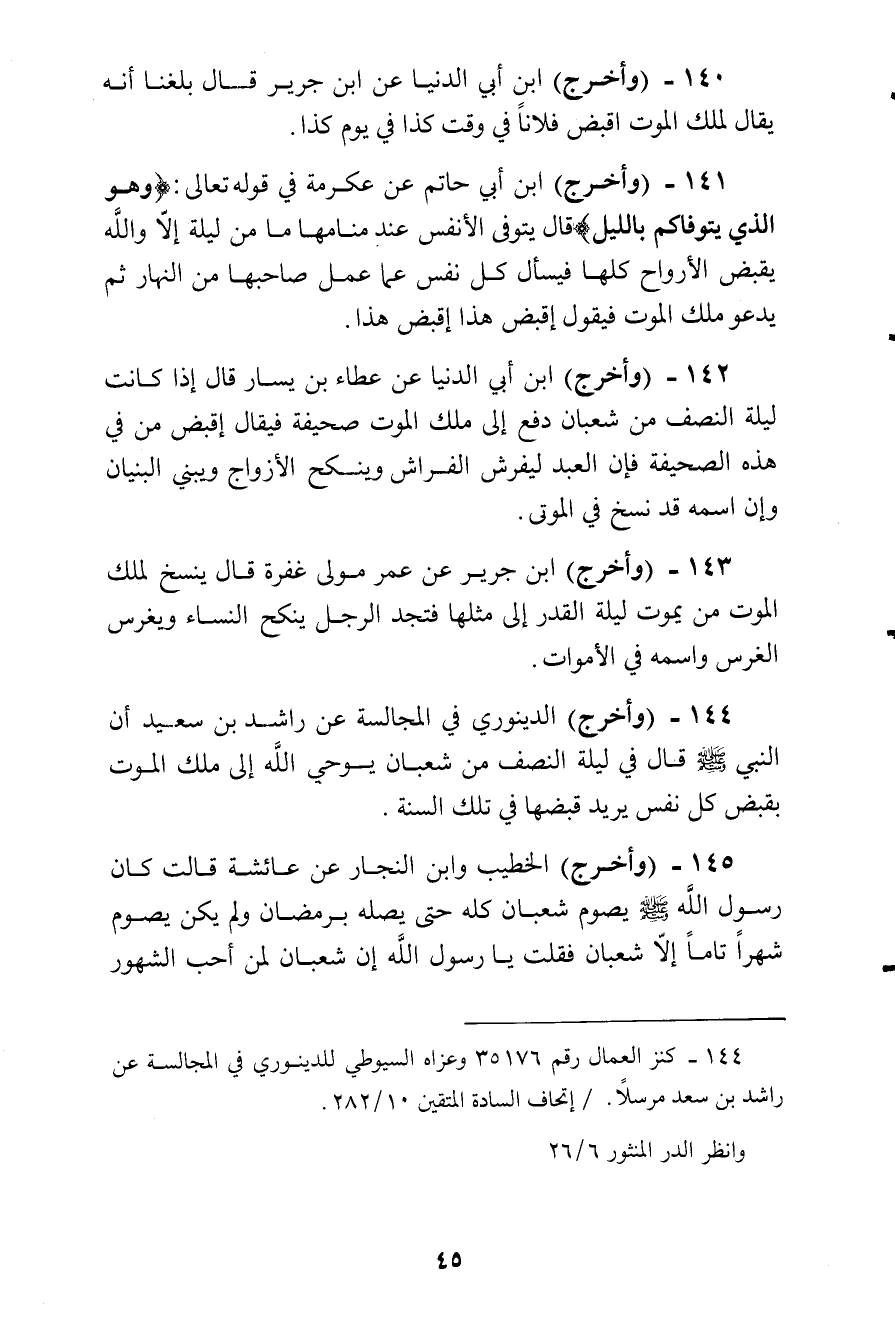 وأخرج الدينورى في المجالسة عن راشد بن سعيد: أن النبي صلى الله عليه وسلم قال:) في ليلة النصف من شعبان يوحى الله إلى ملك الموت بقبض كل نفس يريد قبضها في تلك السنة (.