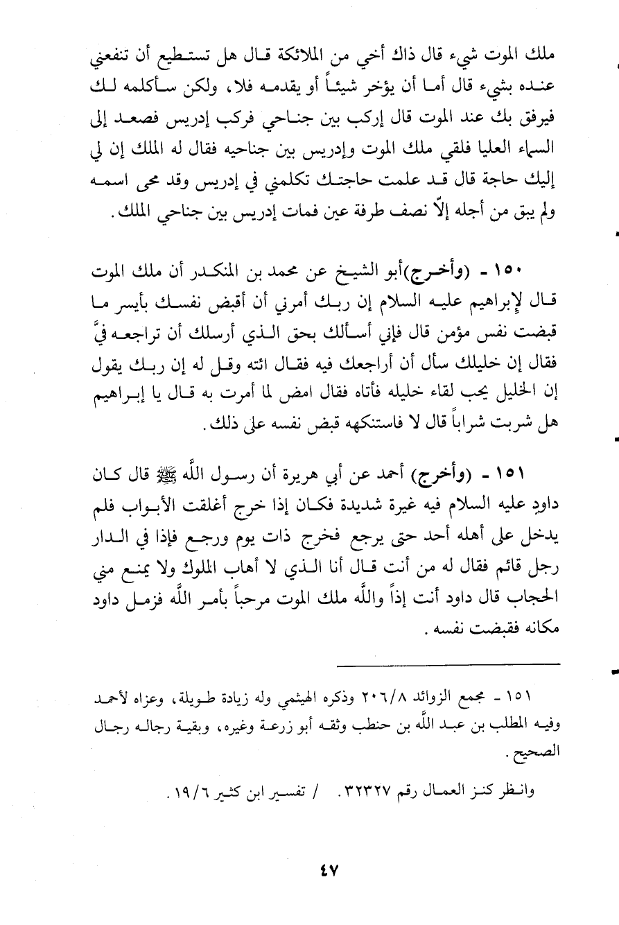 وأخرج أبو الشيخ عن محمد بن المنكدر: أن ملك الموت قال لإبراهيم عليه السلام: إن ربك أمرني أن أقبض نفسك بأيسر ما قبضت نفس مؤمن قال: فإني أسألك بحق الذي أرسلك أن تراجعه فى، فقال: إن خليلك سال أن اراجعك فيه فقال: ائته وقل له: إن ربك يقول: إن الخليل يحب لقاء خليله فأتاه فقال: امض لما أمرت به قال: يا إبراهيم هل شربت شرابا قط؟ قال: لا، فاستنكهه فقبض نفسه على ذلك.