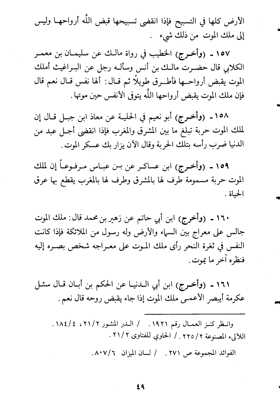 وأخرج الخطيب في رواة مالك عن سليمان بن معمر الكلابيب قال: حضرت مالك بن أنس وسأله رجل عن البراغيث: أملك الموت يقبض أرواحها؟ فأطرق طويلا ثم قال: ألها نفس؟ قال: نعم قال: فإن ملك الموت يقبض أرواحها (الله يَتَوفَى الأَنفُسَ حِينَ مَوتِها)) الزمر: 42 (.