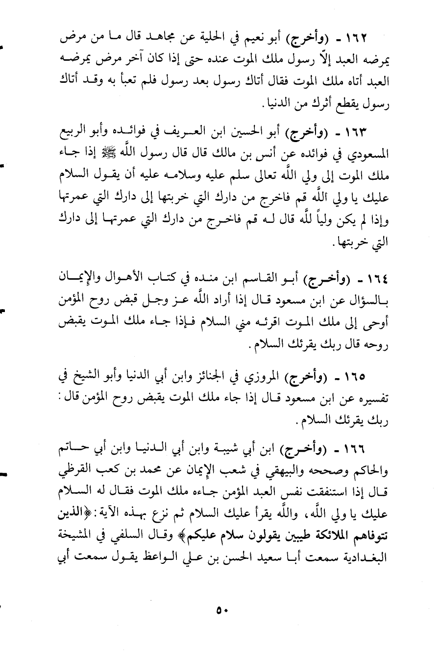 وأخرج ابن أبى شيبة، وابن أبى الدنيا، وابن أبى حاتم، والحاكم وصححه، والبيهقى في شعب الإيمان عن البراء بن عازب في قوله تعالى: (تَحيَتُهُم يَومَ يَلقَونَهُ سَلام)) الأحزاب: 44 (قال: ملك الموت، ليس من مؤمن يقبض روحه إلا يسلم عليه.