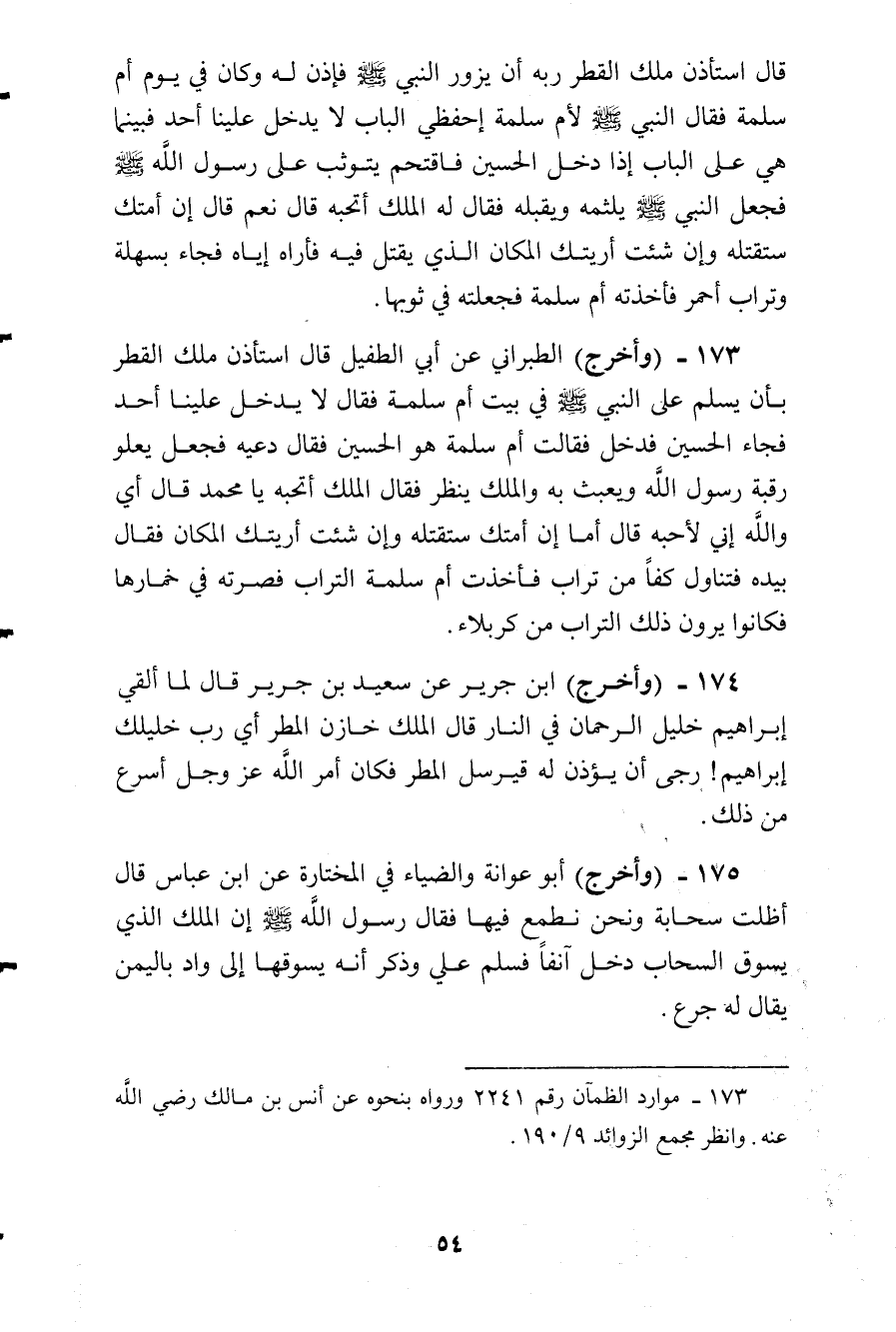 وأخرج الطبرانى عن أبى الطفيل قال: استأذن ملك القطر بأن يسلم على النبي صلى الله عليه وسلم في بيت أم سلمة فقال: لا يدخل علينا أحد، فجاء الحسين فدخل فقالت أم سلمة: هو الحسين فقال: دعيه، فجعل يعلو رقبة رسول الله ويعبث به، والملك ينظر فقال الملك: أتحبه يا محمد؟ قال: أي والله إني لأحبه قال: أما إن أمتك ستقتله، وإن شئت أرأيتك المكان فقال بيده، فتناول كفا من تراب، فأخذت أم سلمة التراب فصرته في خمارها، فكانوا يرون أن ذلك التراب من كربلاء.