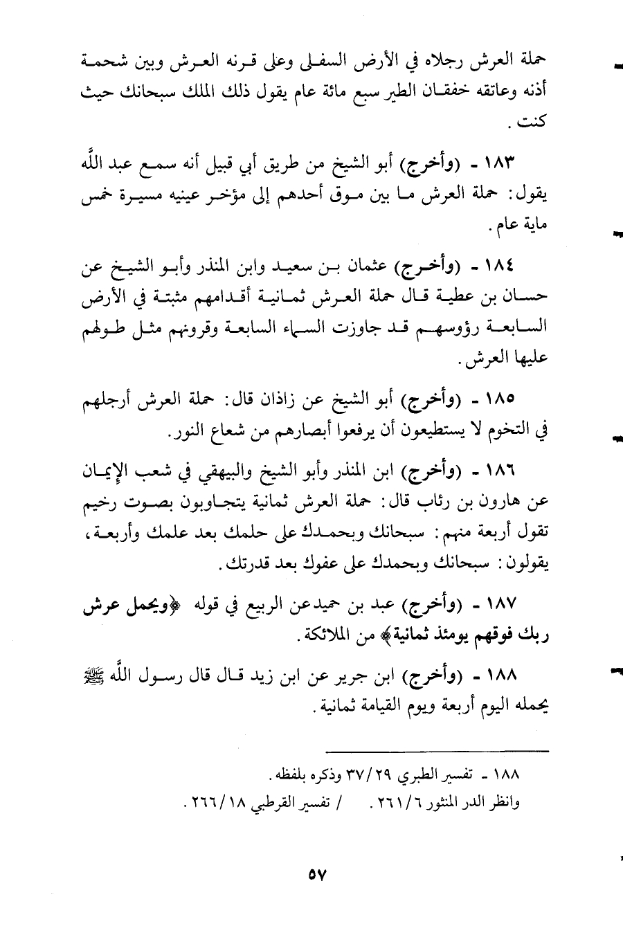 وأخرج ابن المنذر، وأبو الشيخ، والبيهقى في شعب الإيمان عن هارون ابن رئاب قال: حملة العرش ثمانية، يتجاوبون بصوت رخيم تقول أربعة منهم: سبحانك وبحمدك على حلمك بعد علمك وأربعة يقولون: سبحانك وبحمدك على عفوك بعد قدرتك.
