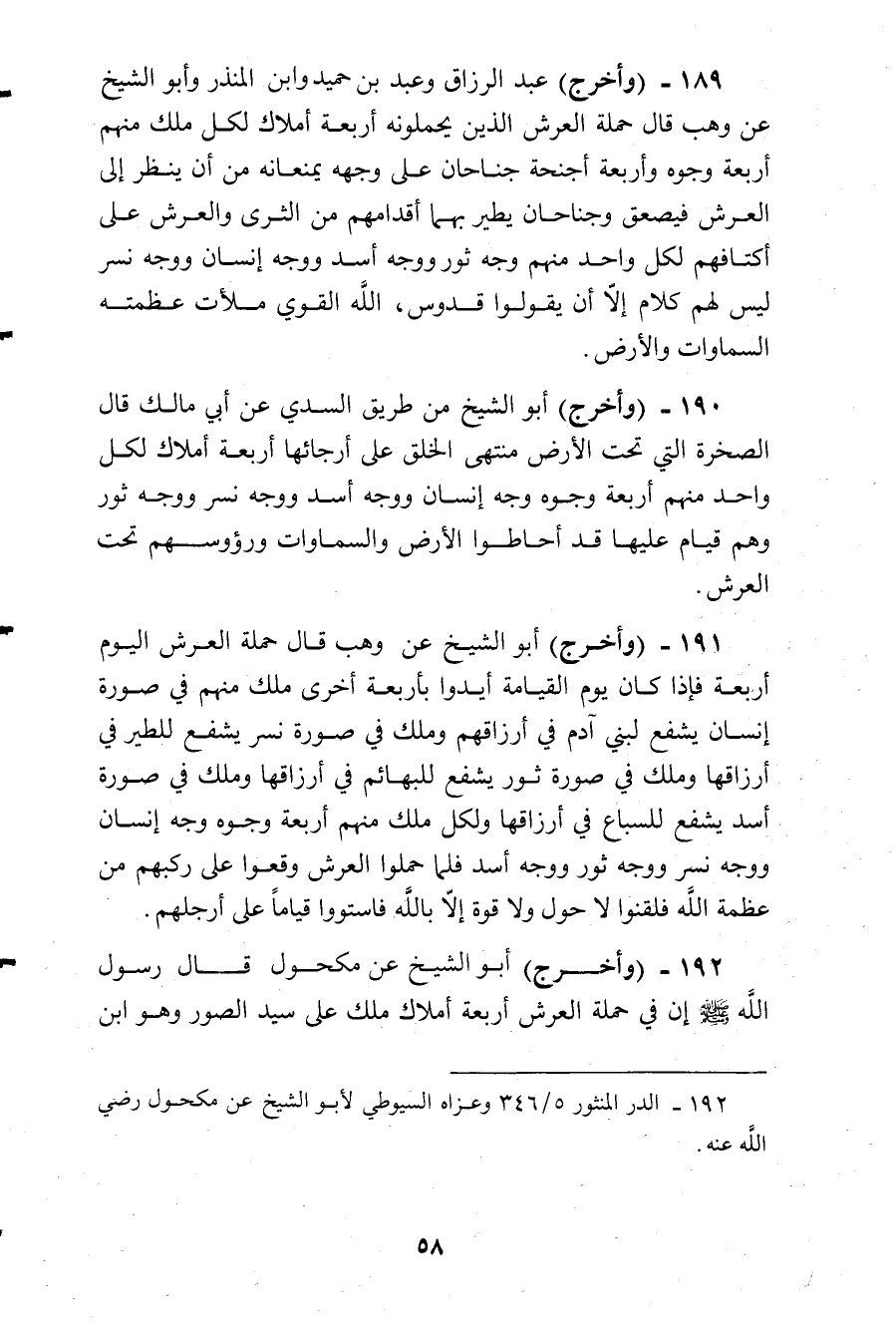 وأخرج أبو الشيخ عن وهب قال: حملة العرش اليوم أربعة، فإذا كان يوم القيامة أيدوا بأربعة أخرى، ملك منهم في صورة إنسان يشفع لبني آدم في أرزاقهم، وملك في صورة نسر يشفع للطير في أرزاقها، وملك في صورة ثور يشفع للبهائم في أرزاقها، وملك في صورة أسد يشفع للسباع في أرزاقها، ولكل ملك منهم: أربعة وجوه: وجه إنسان، ووجه نسر، ووجه ثور، ووجه أسد، فلما حملوا العرش وقعوا على ركبهم من عظمة الله فلقنوا: لا حول ولا قوة إلا بالله، فاستووا قياما على أرجلهم.