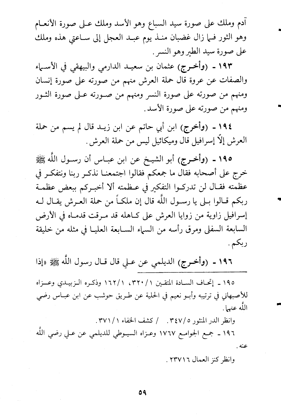 وأخرج عثمان بن سعيد الدارمى، والبيهقى في الأسماء والصفات عن عروة قال: حملة العرش منهم من صورته على صورة إنسان، ومنهم من صورته على صورة النسر، ومنهم من صورته على صورة الثور، ومنهم من صورته على صورة الأسد.