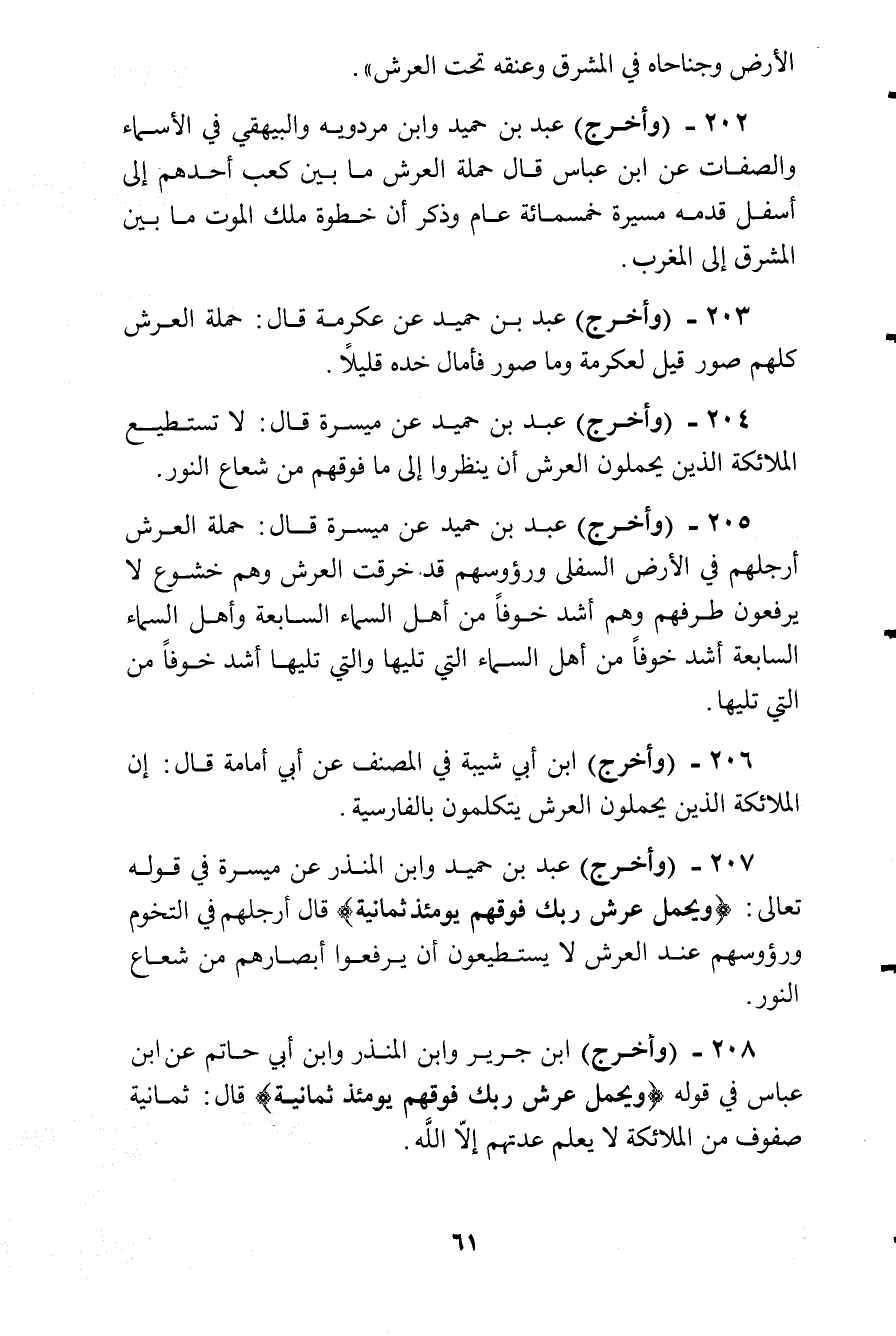 وأخرج عبد بن حميد وابن المنذر عن ميسرة في قوله تعالى: (وَيَحمِلُ عَرشَ رَبِكَ فَوقَهُم يَومَئِذٍ ثَمانِيَة) قال: أرجلهم في التخوم ورؤوسهم عند العرش لا يستطيعون أن يرفعوا أبصارهم من شعاع النور.