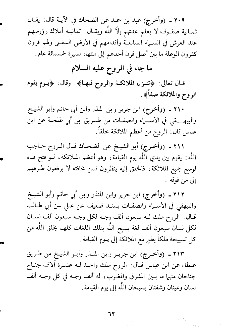 وأخرج ابن جرير وابن المنذر وابن أبى حاتم وأبو الشيخ والبيهقى في الأسماء والصفات بسند ضعيف عن علي بن أبى طالب قال: الروح ملك له سبعون ألف وجه، لكل وجه سبعون ألف لسابن، لكل لسان سبعون ألف لغة، يسبح الله بتلك اللغات كلها، يخلق الله من كل تسبيحة ملكا يطير مع الملائكة إلى يوم القيامة.