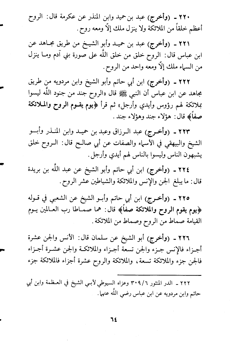 وأخرج عبد الرزاق وعبد بن حميد وابن المنذر وأبو الشيخ والبيهقى في الأسماء والصفات عن أبى صالح قال: الروح خلق يشبهون الناس وليسوا بالناس لهم أيد وأرجل.