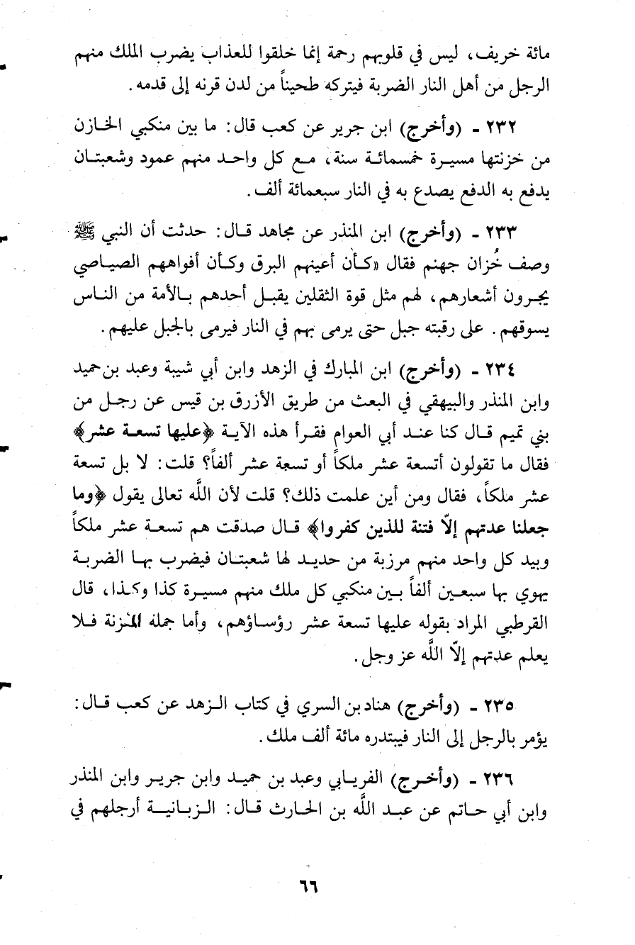 وأخرج ابن المبارك في الزهد وابن أبى شيبة وعبد بن حميدي وابن المنذر والبيهقى في البعث من طريق الأزرق بن قيسك عن رجل من بنى تيمم قال: كنا عند أبى العوام فقرأ هذه الآية (عَلَيها تِسعَةَ عَشَر) فقال: ما تقولون؟ أتسعة عشر ملكا أو تسعة عشر ألفا؟ قلت: لا، بل تسعة عشر ملكا، فقال: ومن أين علمت ذلك؟ قلت: لأن الله تعالى يقول (وَما جَعَلنَا عِدَتَهُم إِلا فِتنَةً لِلَذَينَ كَفَرُوا) قال: صدقت، هم تسعة عشر ملكا، وبيد كل واحد منهم مرزبة من حديد، لها شعبتان، فيضرب بها الضربة يهوى بها سبعين ألفا، بين منكبى كل ملك منهم مسيرة كذا، وكذا، قال القرطبى: المراد بقوله: (عَلَيها تِسعَةَ عَشَر) : رؤساؤهم، وأما جملة الخزنة فلا يعلم عدتهم إلا الله عز وجل.